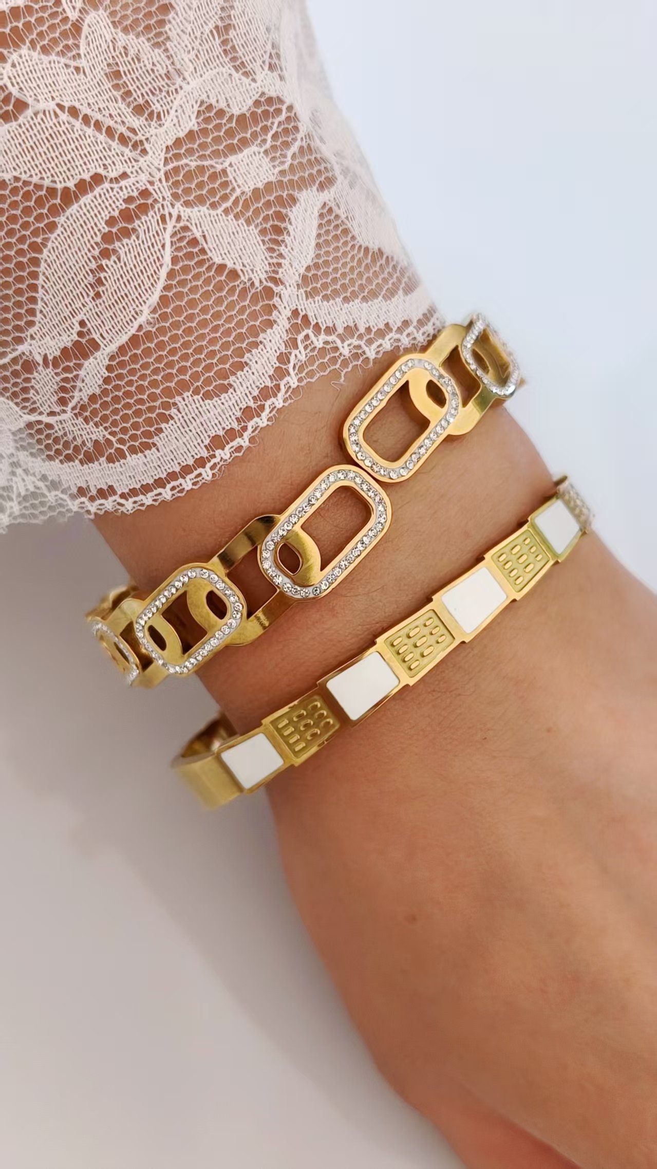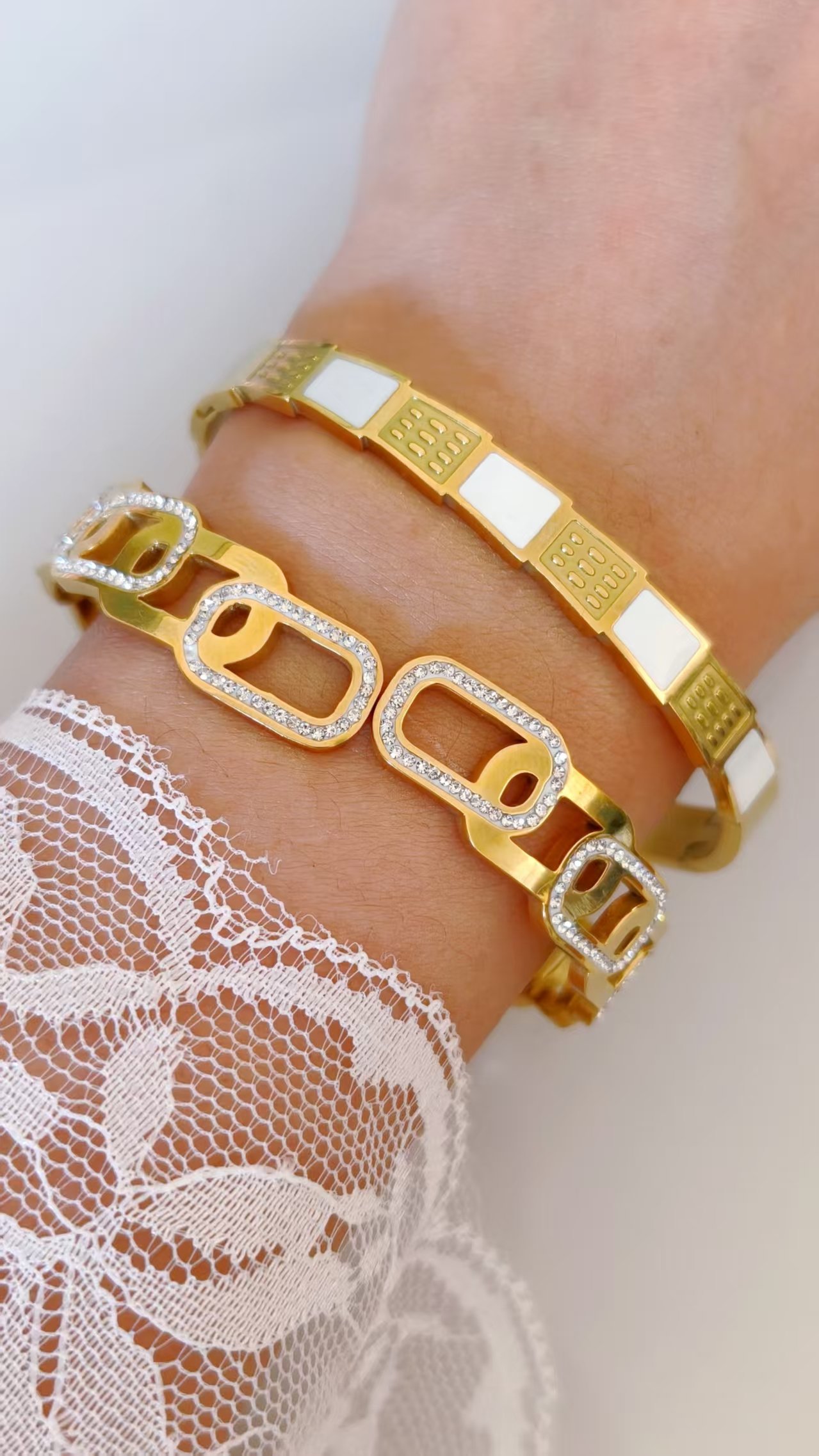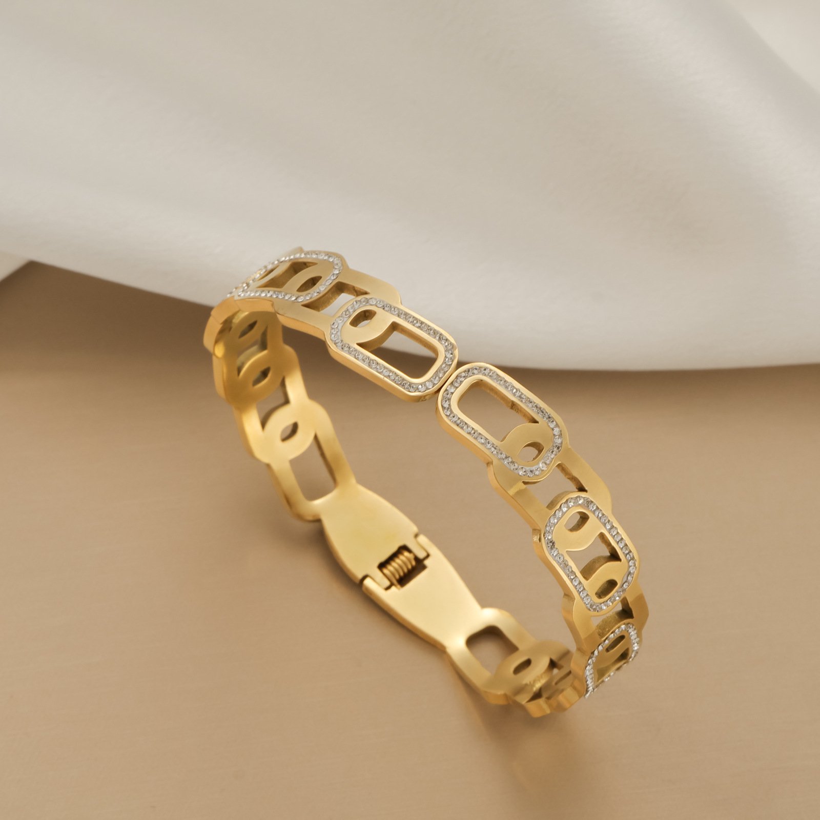 Crafted on a solid titanium steel base, this bangle is completely tarnish-free and fully water-resistant. The link edges maintain their crisp, precise geometry, the pavé zircon borders keep their full continuous sparkle rectangle after rectangle, and the 18K gold finish holds its warm brilliance through every wear and every wash. Architectural precision built to last permanently.