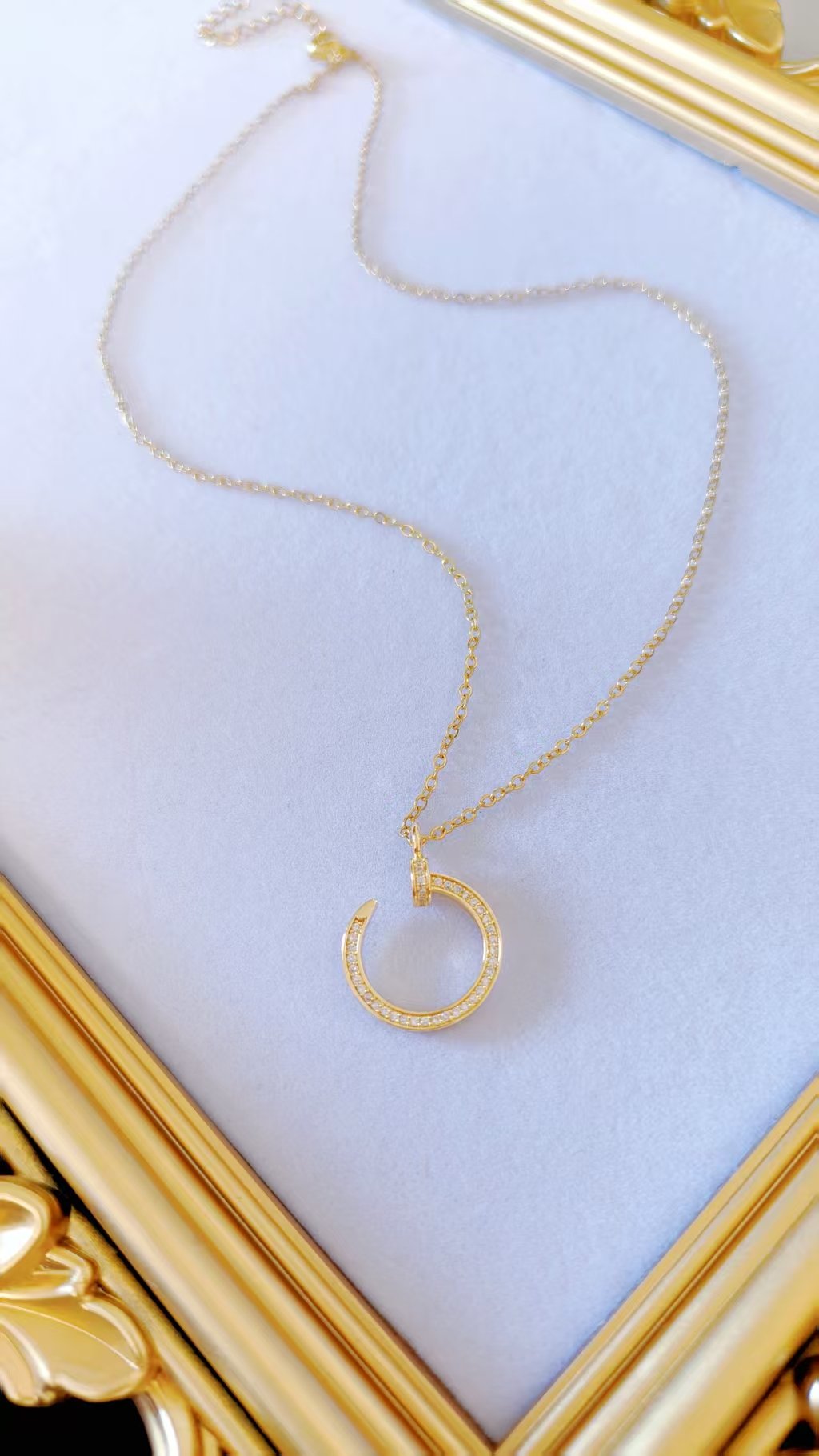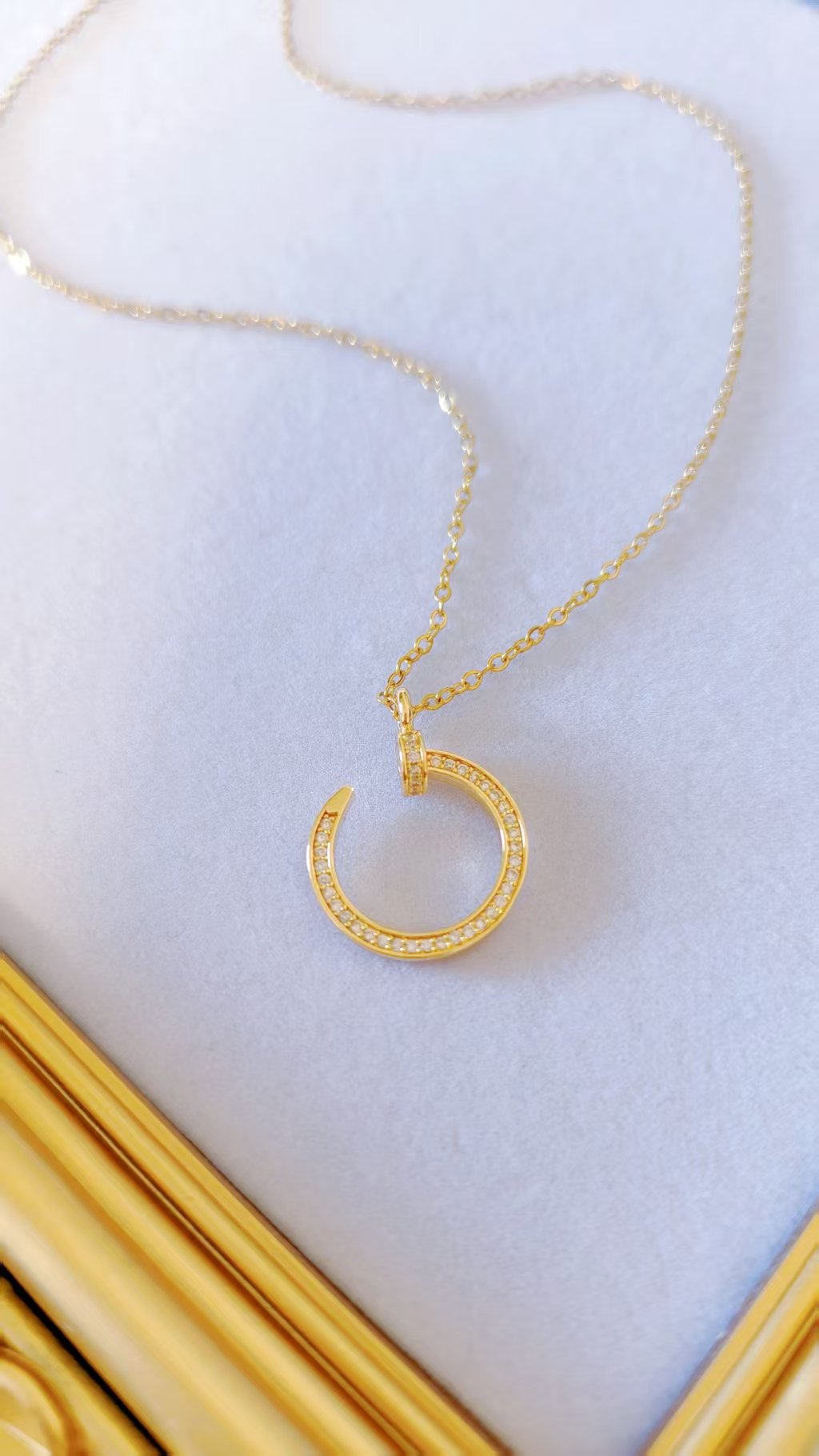 Introducing the HEYBIJOU Pavé Nail Circle Pendant Necklace — a bold, deeply recognisable nail motif bent into a full circle and encrusted from tip to head with an unbroken row of dazzling pavé zircons. It’s architectural, it’s fashion-forward, and it carries the unmistakable energy of luxury house jewelry — the kind of pendant that communicates genuine taste the moment it catches the light. Worn at the collarbone on a fine gold cable chain, it is quietly, powerfully extraordinary.