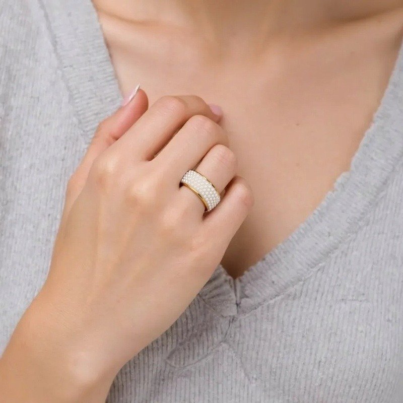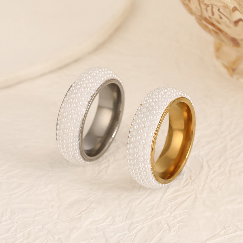Crafted on ultra-durable titanium steel with luxurious plating, this ring offers exceptional strength, lightweight comfort, and that authentic premium metallic finish. The pearls are securely set in a dense, bubble-like formation for continuous depth and gentle glow, turning the wide band into a shimmering focal point with no visible gaps. Available in sizes #6 to #10, it provides a comfortable, true-to-size fit – substantial enough to command attention yet perfectly balanced for all-day wear. Ideal for stacking with dainty bands, wearing solo as a bold accent, or pairing with any look from casual chic to evening elegance!