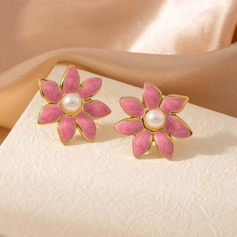 HEYBIJOU pearl center enamel flower stud earrings—vibrant colors on 18K gold-plated titanium steel. Tarnish-free, water-resistant luxury blooms with real pearl glow!