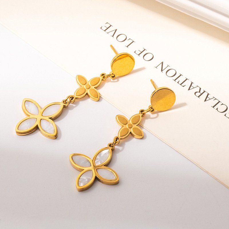 Double clover drop earrings β solid gold top, mother of pearl bloom below. Tarnish-free & waterproof. HEYBIJOU πΏπ€ Timeless floral luxury.