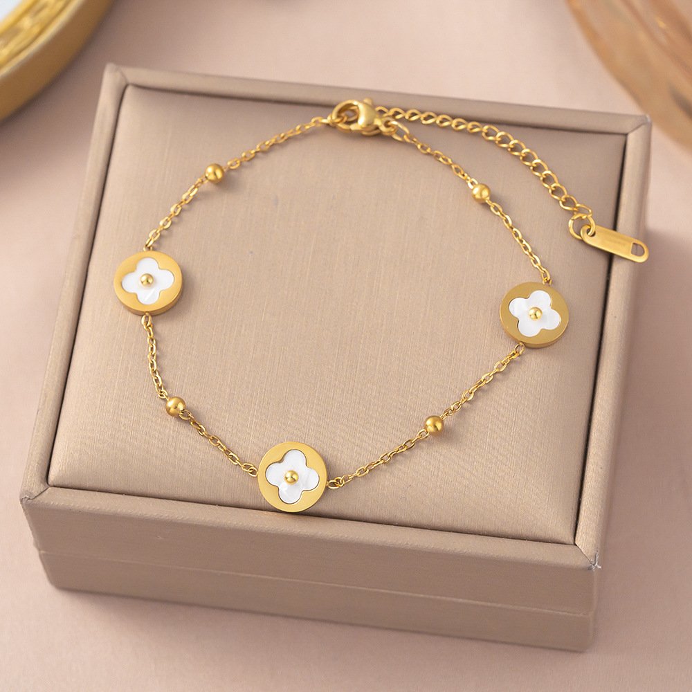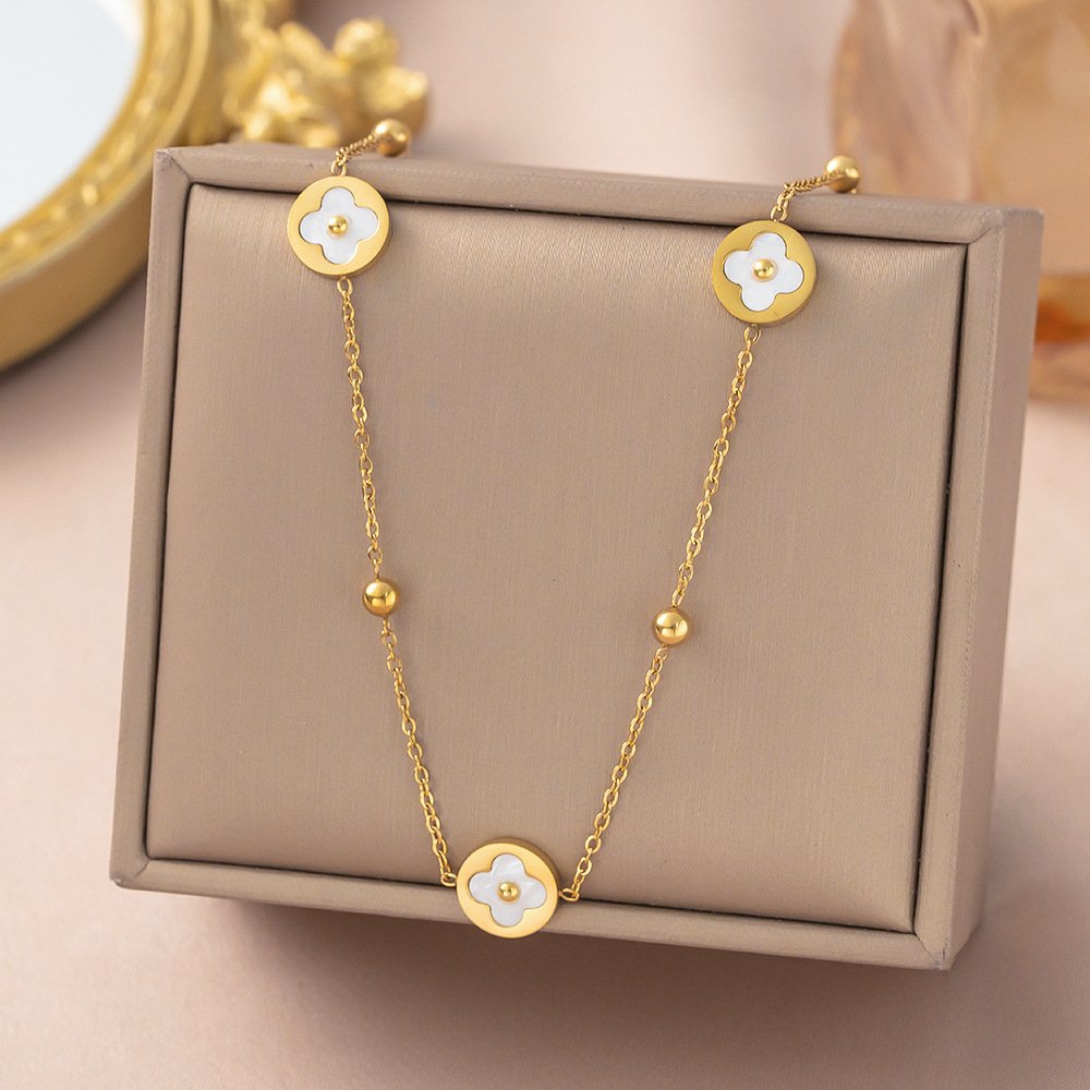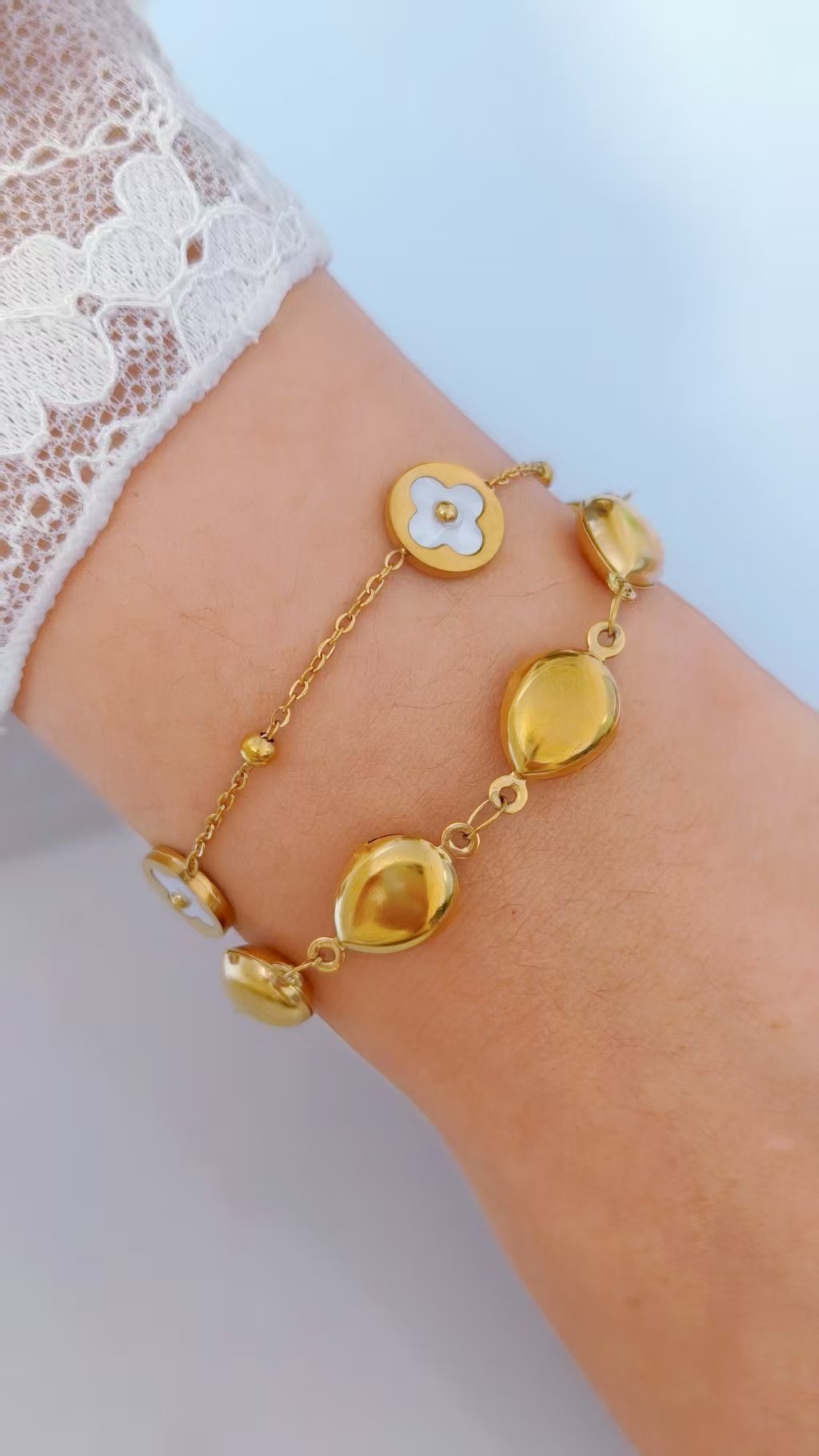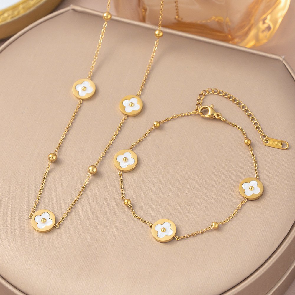 Introducing the HEYBIJOU Pearl Clover Disc Station Set — a delicately charming matched necklace and bracelet where smooth round gold disc medallions, each centred with a luminous white shell flower, are scattered along a fine gold cable chain between polished gold bead accents. The result is a set that feels like sunlight through a window — warm, soft, endlessly cheerful, and genuinely beautiful in the most effortless way imaginable. This is the jewelry you wear when you want to feel like your best self without trying.