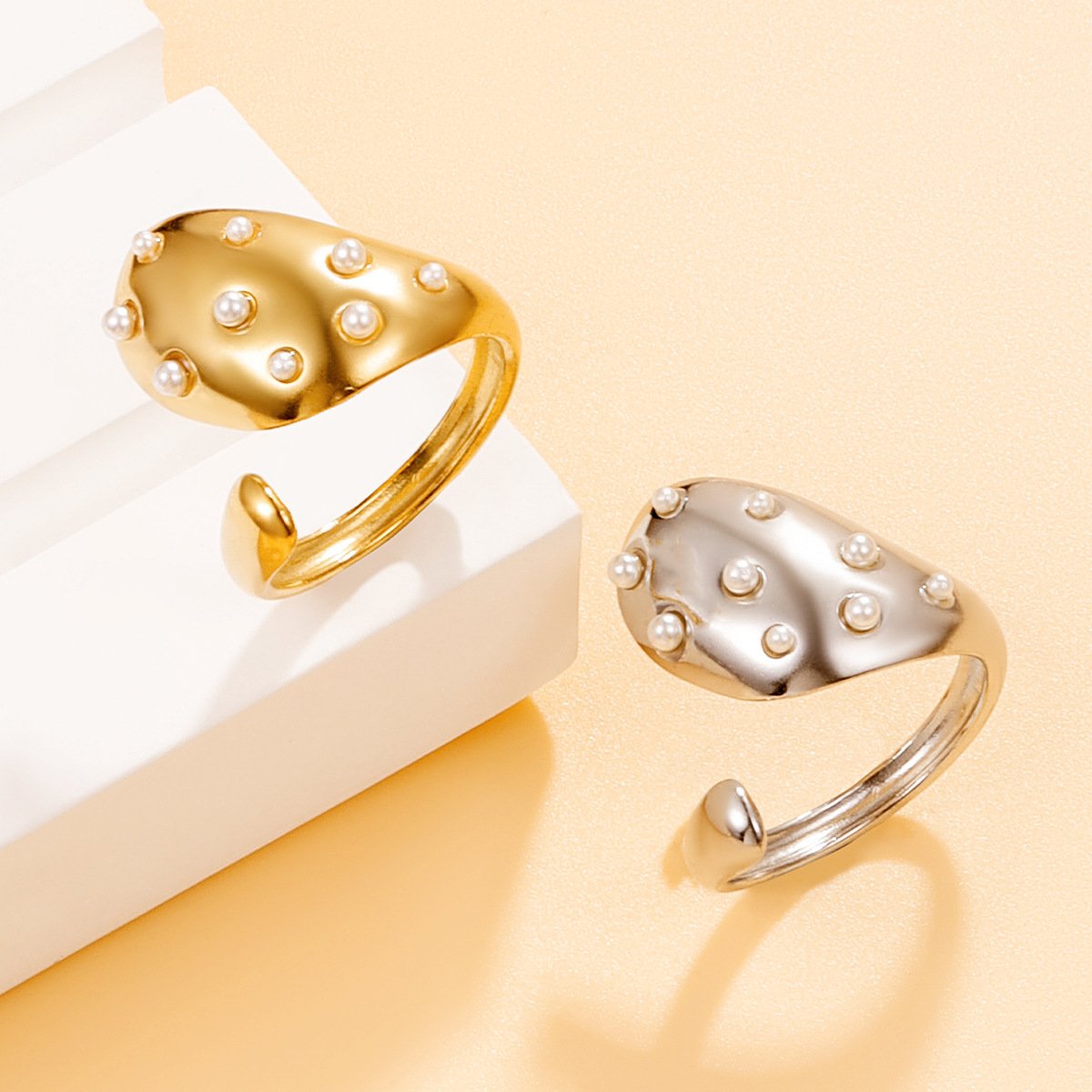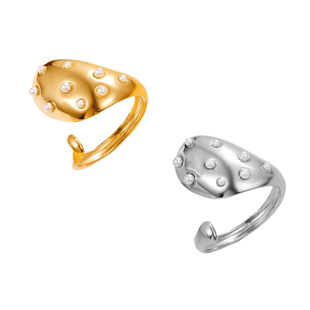 Bold 18K gold/silver plated titanium steel with scattered real pearls. Tarnish-free, waterproof luxury statement. Adjustable open fit – pure fire!
