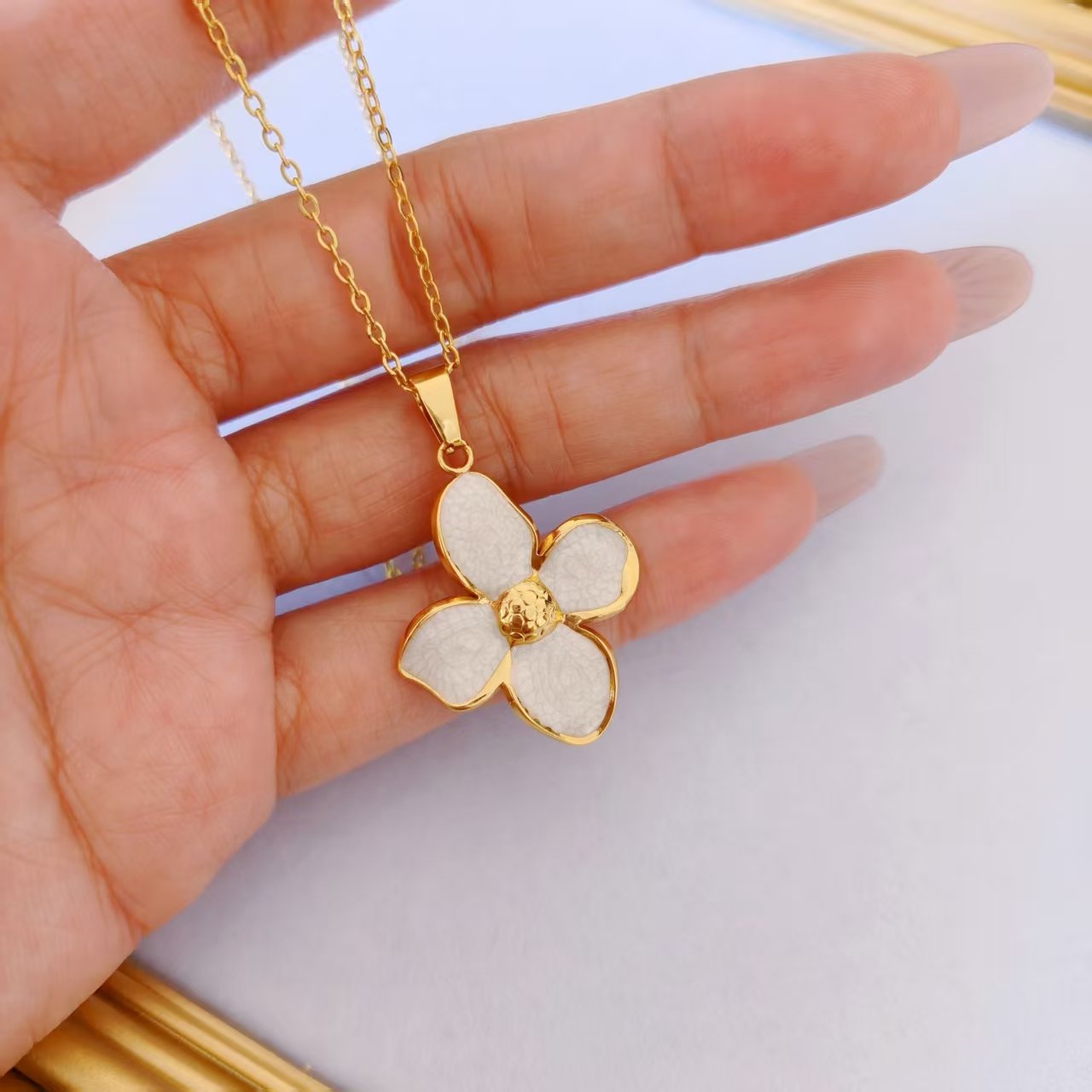 Expertly crafted from premium titanium steel with luxurious 18K gold plating, this jewelry set delivers cohesive elegance from head to toe! Each flower features four petals filled with genuine mother of pearl that displays beautiful natural variations and luminous glow. The textured gold center adds dimensional detail and vintage-inspired charm, while the smooth gold frames create perfect contrast. The delicate chain on the necklace complements the dainty proportions of the stud earrings beautifully. Here’s what makes this set absolutely exceptional: both pieces are completely tarnish-free and water-resistant! Wear your complete set through showers, beach days, workouts, pool swims, and everyday adventures without ever removing them. The mother of pearl maintains its lustrous iridescence, the gold stays brilliantly radiant, and you experience zero maintenance or worry. It’s matching luxury that’s built for real life!