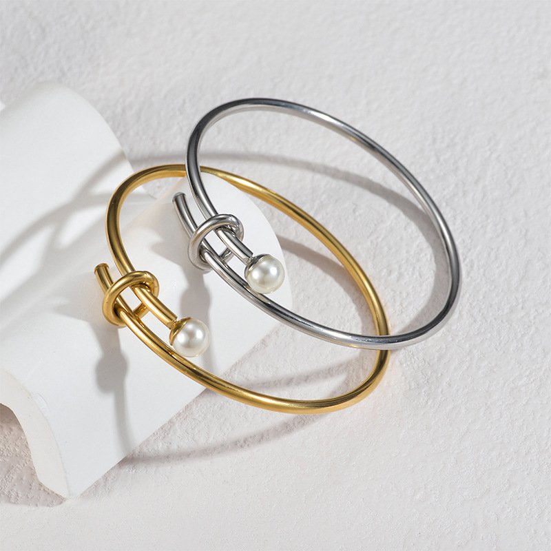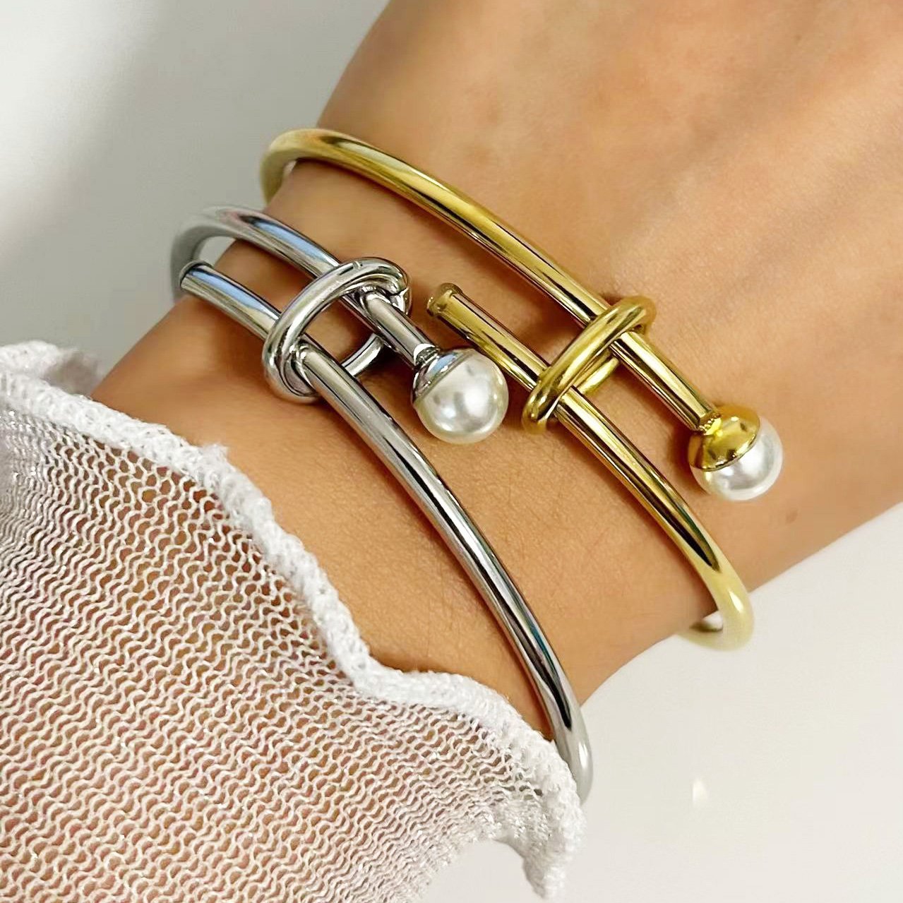 Elegant pearl knot cuff bangles in gold & silver. Modern minimalist design with lustrous pearl accent. Stackable luxury titanium jewelry.