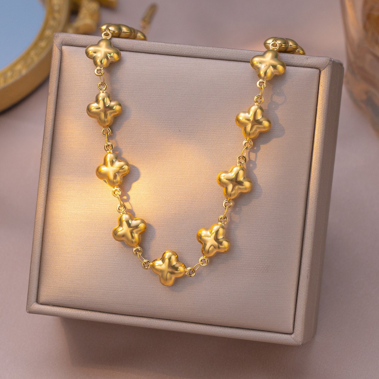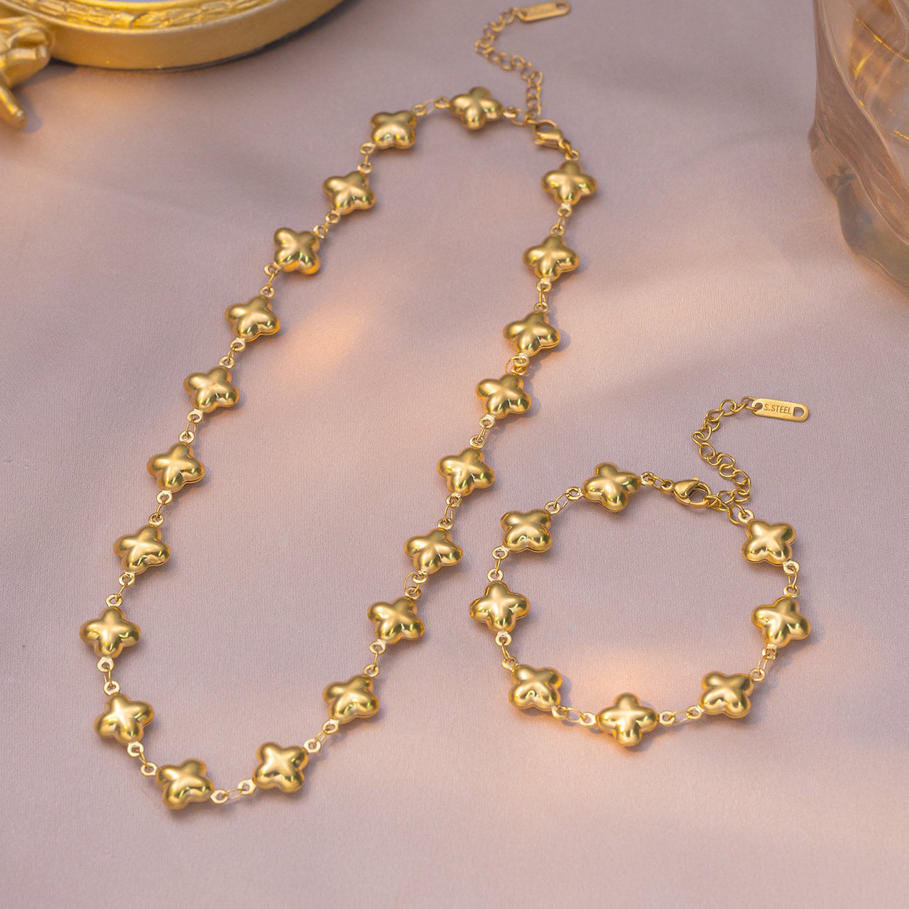 Clover connects to clover with only the finest rings between them — creating a continuous flow of golden blooms from clasp to clasp with no plain chain interrupting the pattern. The necklace sits below the collarbone as a statement-length piece, while the bracelet wraps the wrist in the same unbroken clover sequence. Together they create a coordinated set that looks intentional, curated, and completely elevated.