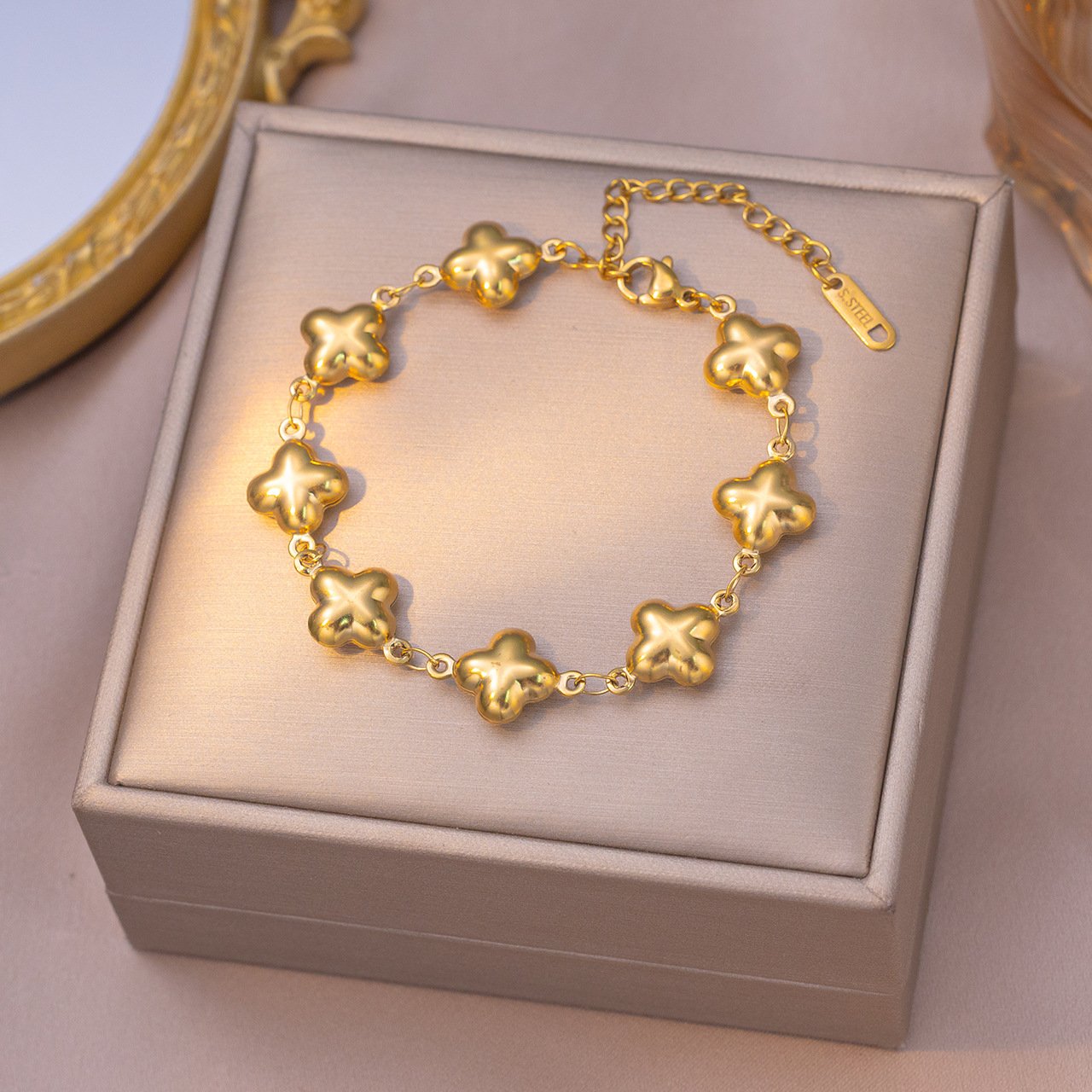 Each clover link is gloriously three-dimensional — four plump, rounded petals fanning outward from a raised center, each one smooth and domed like a tiny pillow of solid gold. The mirror-high polish finish means that light hits every curved surface from a different angle simultaneously, creating a dynamic, rolling shimmer as the chain moves that is completely unique to this rounded, sculptural form. Unlike flat-stamped clovers, these catch shadows between their petals and glow on their crowns — alive, warm, and endlessly beautiful in every light.
