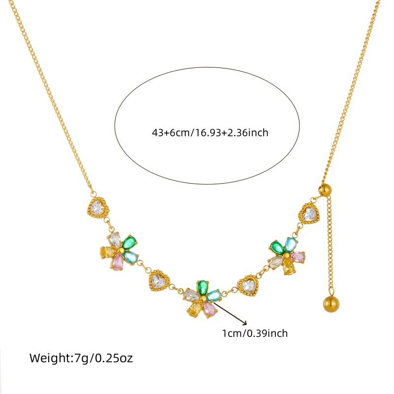 Bloom with joy in HEYBIJOU’s Rainbow Blossom Zircon Necklace—18k gold-plated titanium steel with colorful flower & heart zircons. Tarnish-free vibrant elegance!