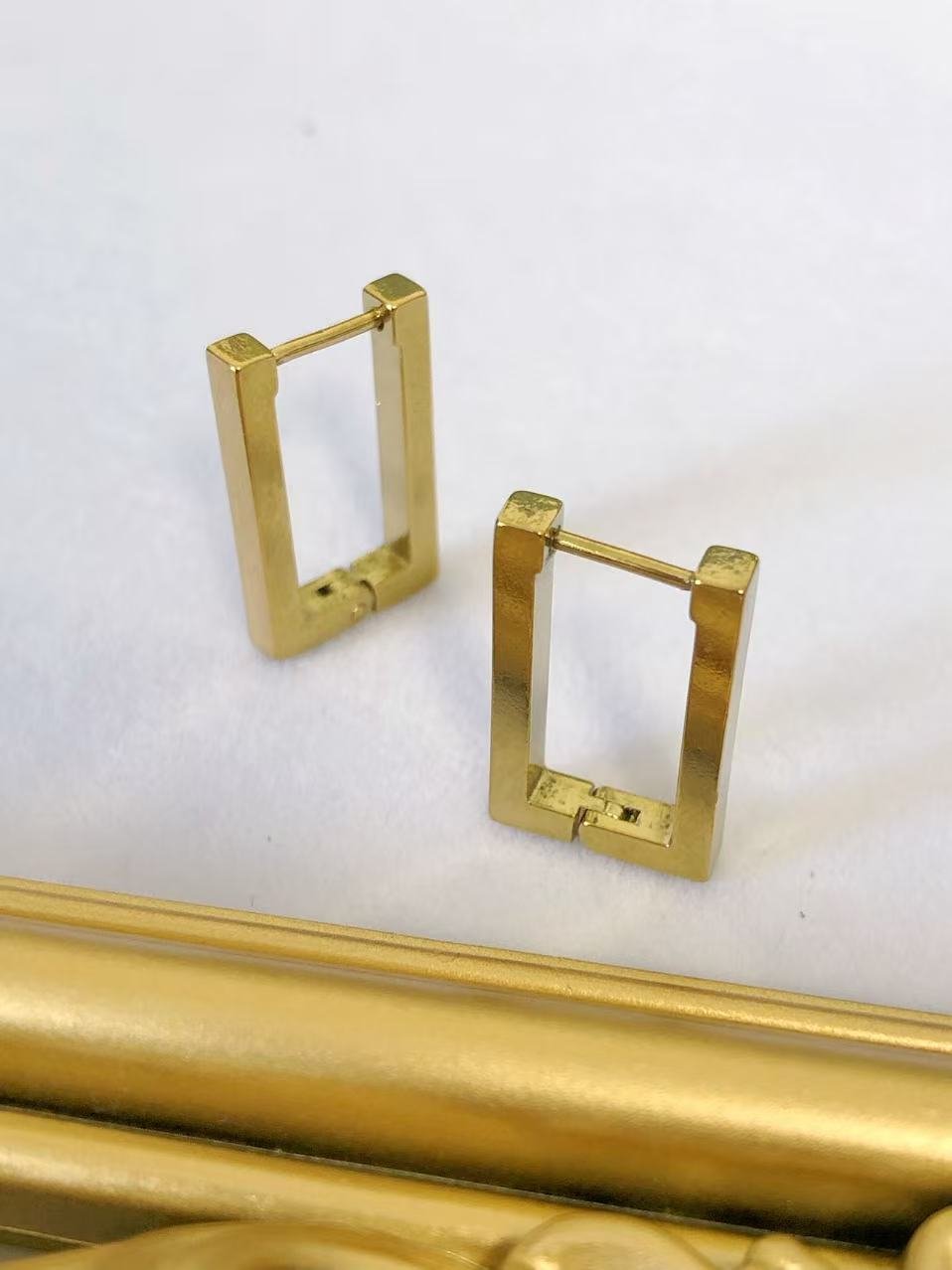 Rectangle huggie hoop earrings in 18k gold. Modern geometric design, hinged closure, tarnish-free. Contemporary minimalist hoops. Shop HEYBIJOU!