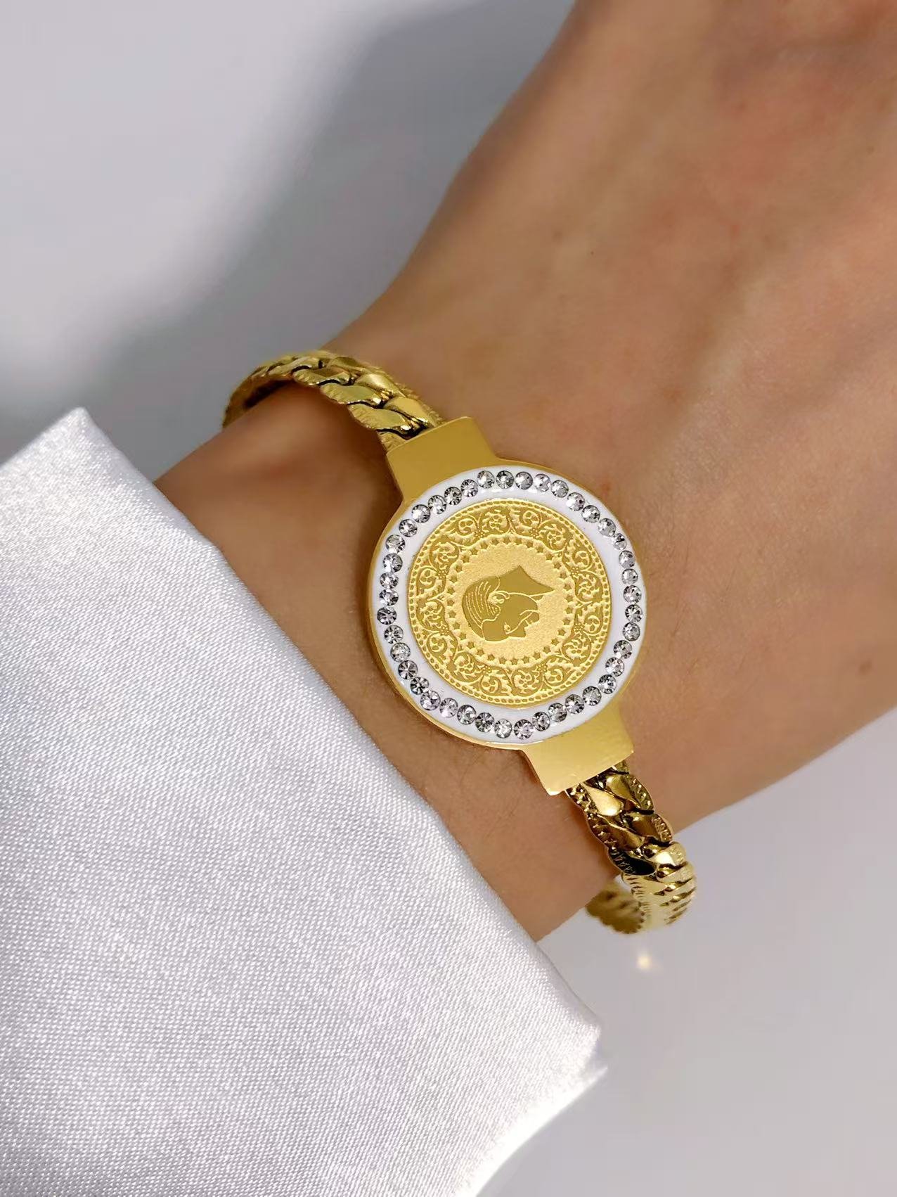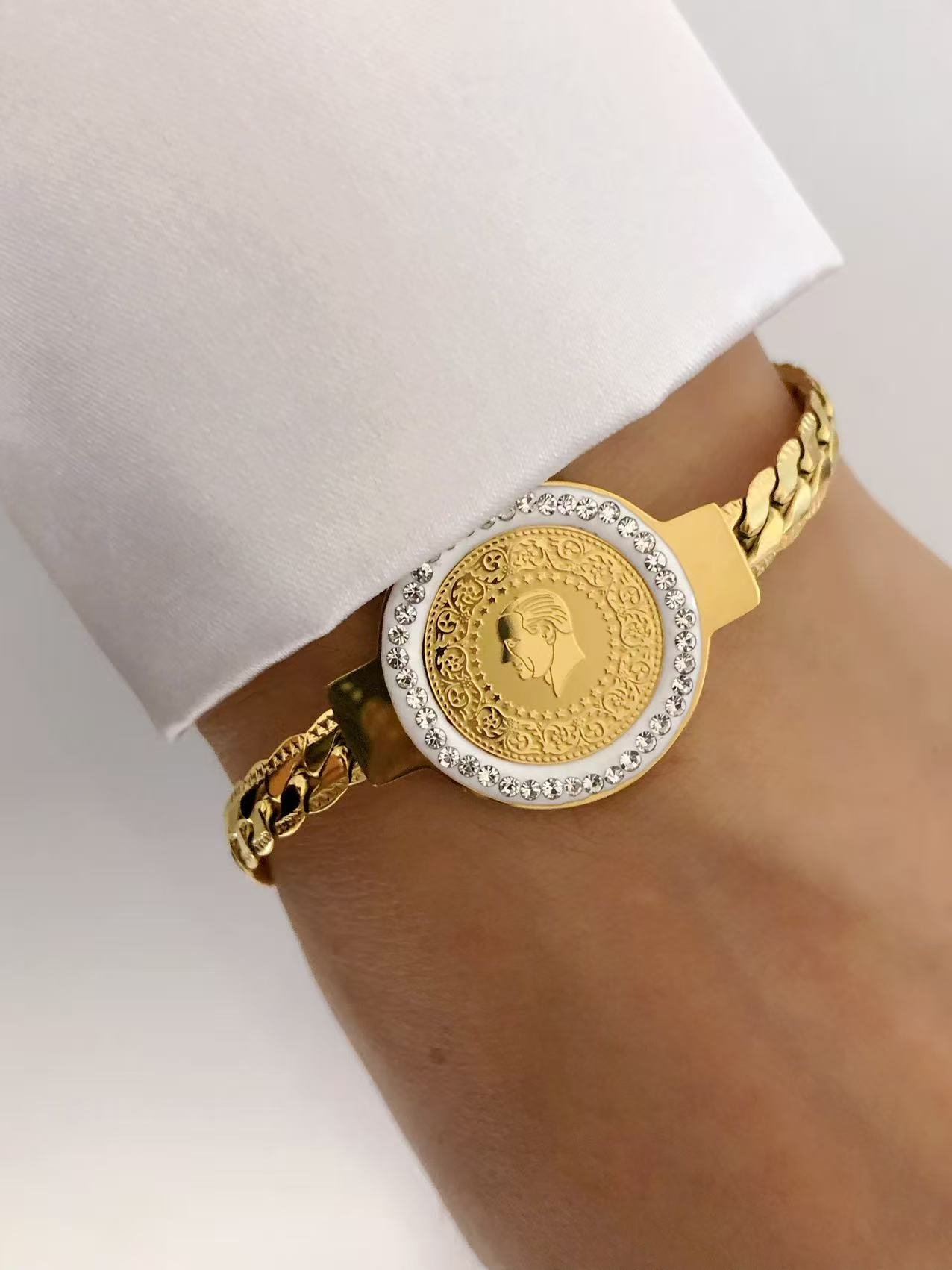Elevate your style with this 18K gold plated titanium bracelet featuring a coin pendant framed by shimmering zircons. Bold, elegant, and durable.