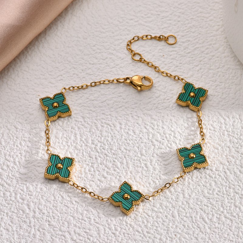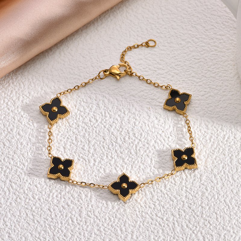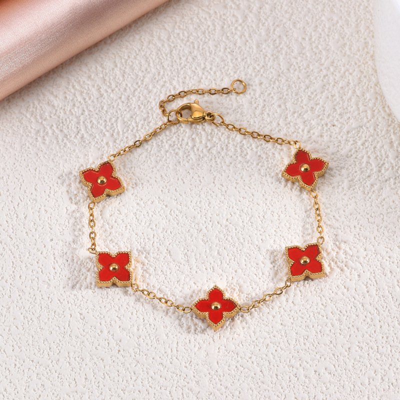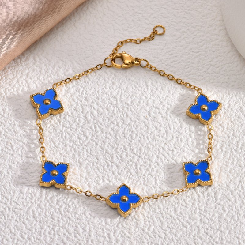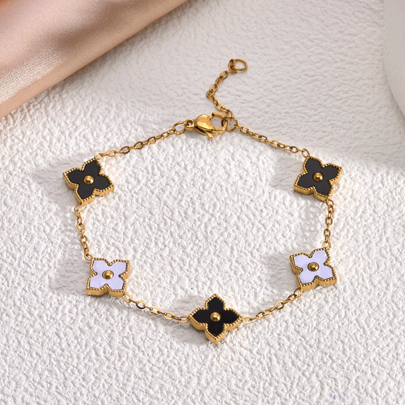 Crafted from premium titanium steel with luxurious 18K gold plating, every double-faced clover is edged in intricate gold for that signature high-end detail. The reversible feature is seamlessly engineered — flip them effortlessly for a new color story every day. Completely tarnish-free and water-resistant, this bracelet stays stunning through showers, swims, and daily adventures without losing its vibrant colors or golden shine. Hypoallergenic, lightweight, and finished with an adjustable lobster clasp for a perfect, comfortable fit.