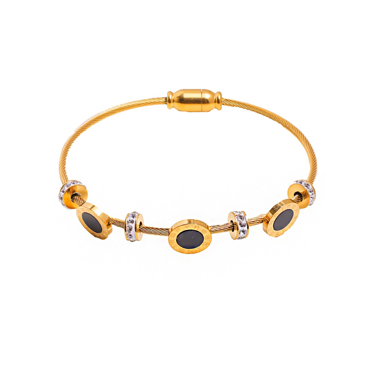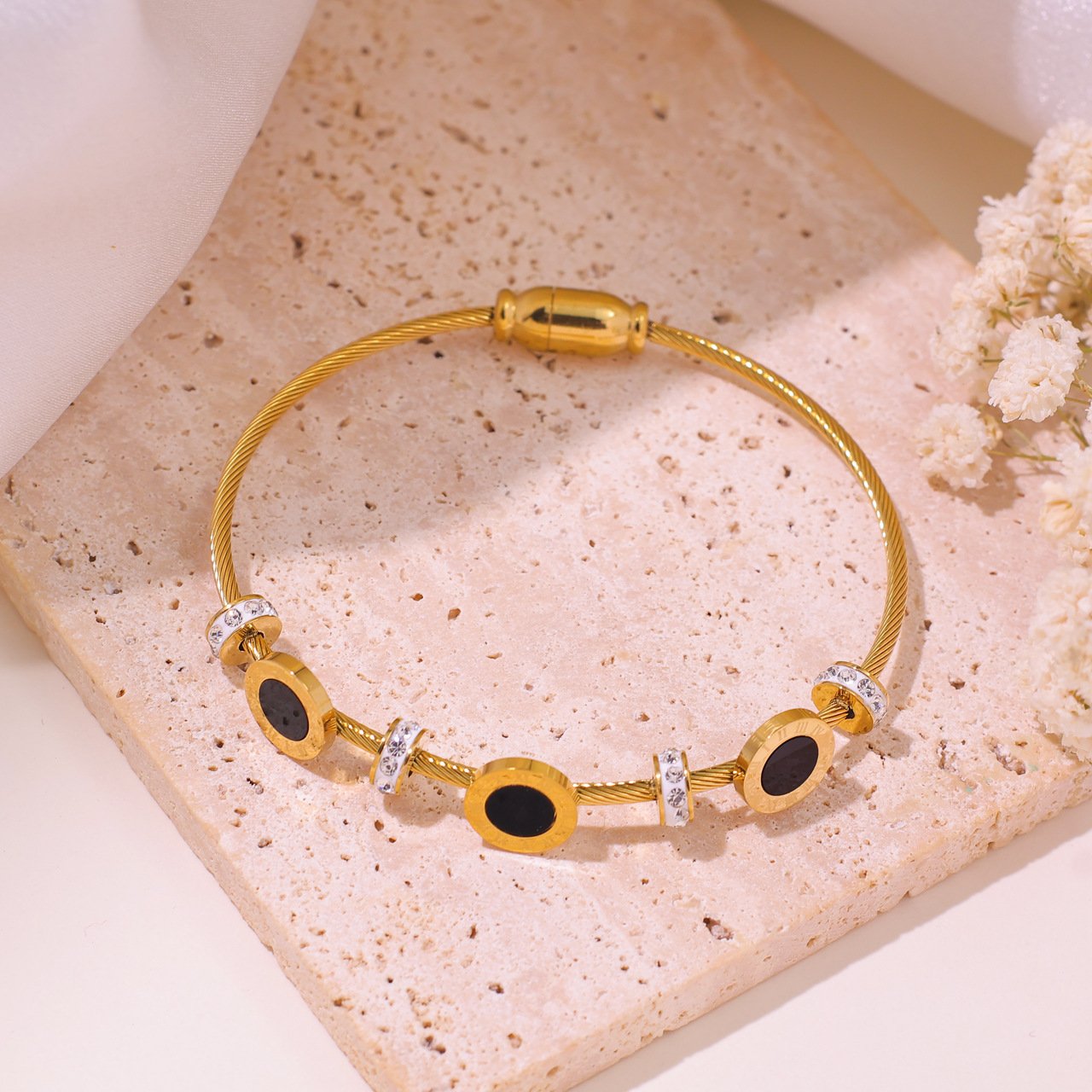 Crafted on a solid titanium steel base, this bracelet is completely tarnish-free and fully water-resistant. At 13.5g across 60mm, it wears with genuine substance. The onyx discs maintain their deep finish, the zircon rings keep their full sparkle, and the cable wire holds its twisted texture and warm gold tone through every wear and every wash. A bracelet that earns its place as a daily signature piece — always.