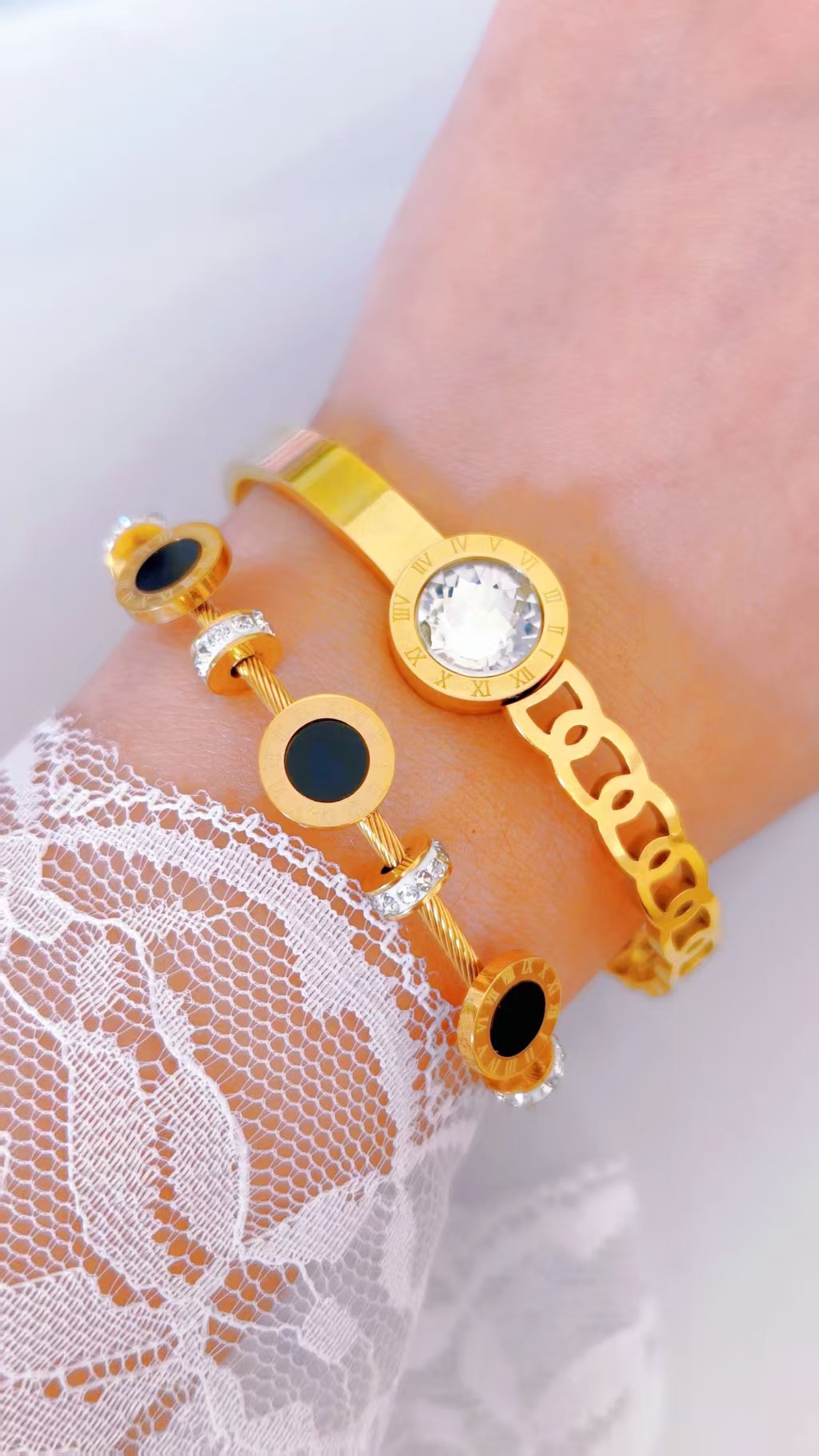 Triple Roman numeral onyx disc & pavé zircon ring bracelet on twisted cable wire. 13.5g, tarnish-free. HEYBIJOU ⌚✨ Time, sparkle & pure luxury.