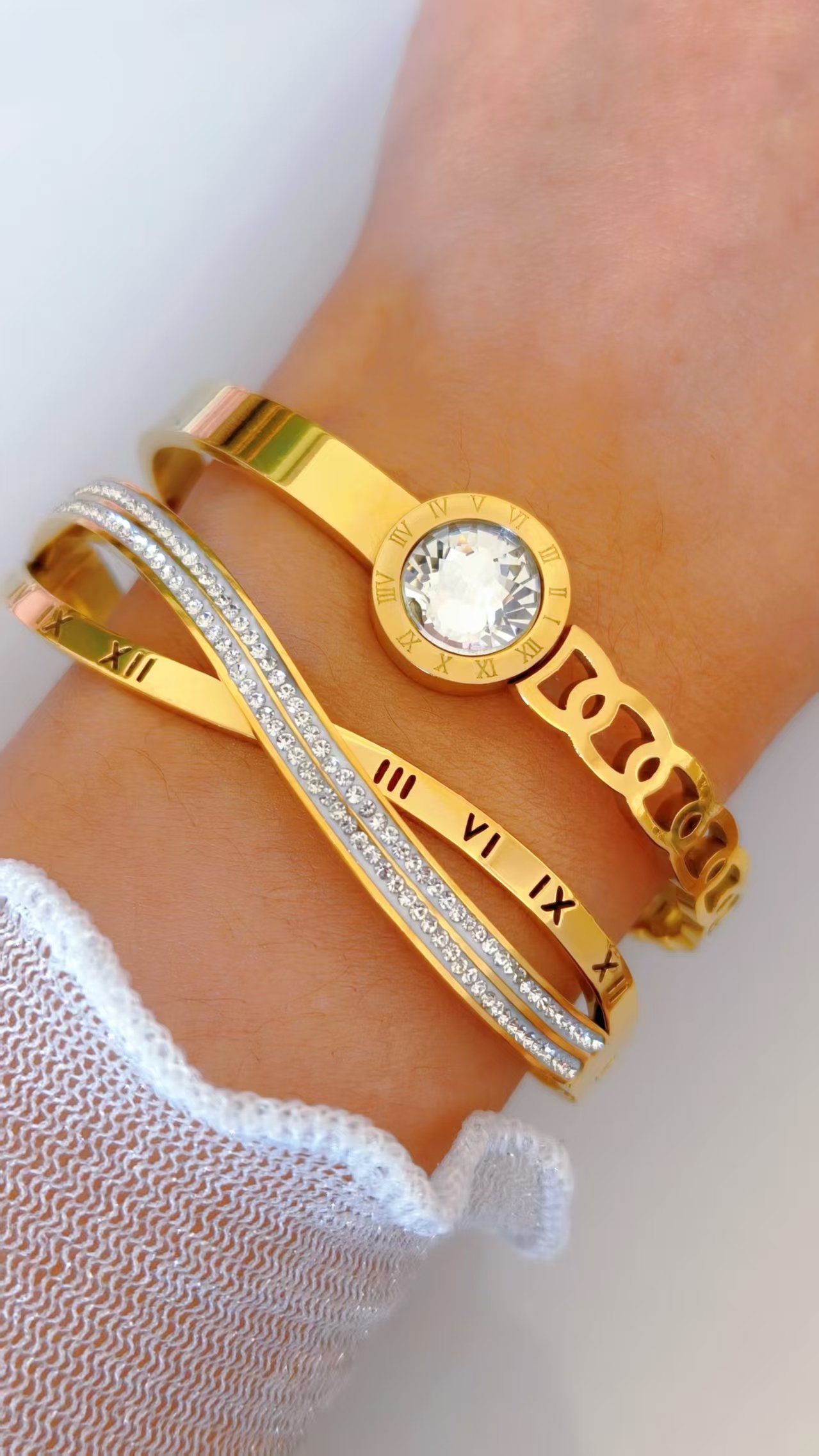 Crossover gold bangle with Roman numeral band & pavé zircon rail in twisted X design. Tarnish-free. HEYBIJOU ⏳✨ Where time meets brilliance.