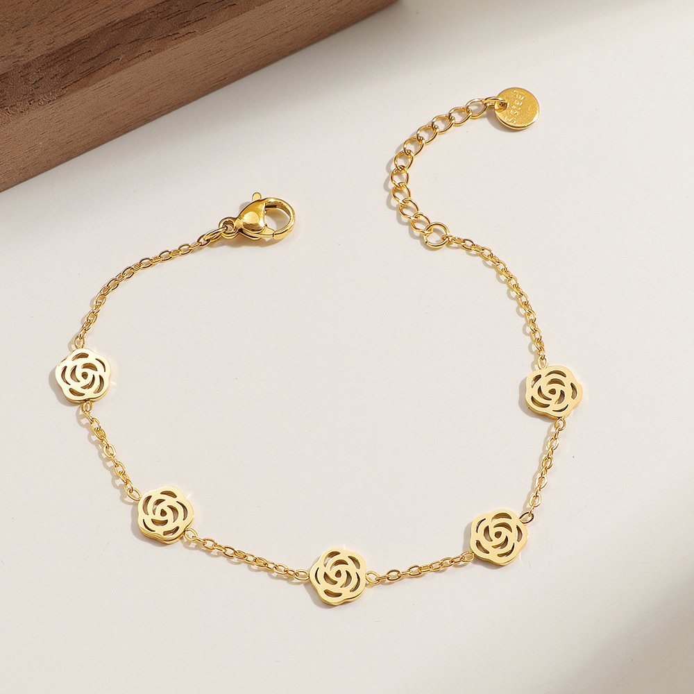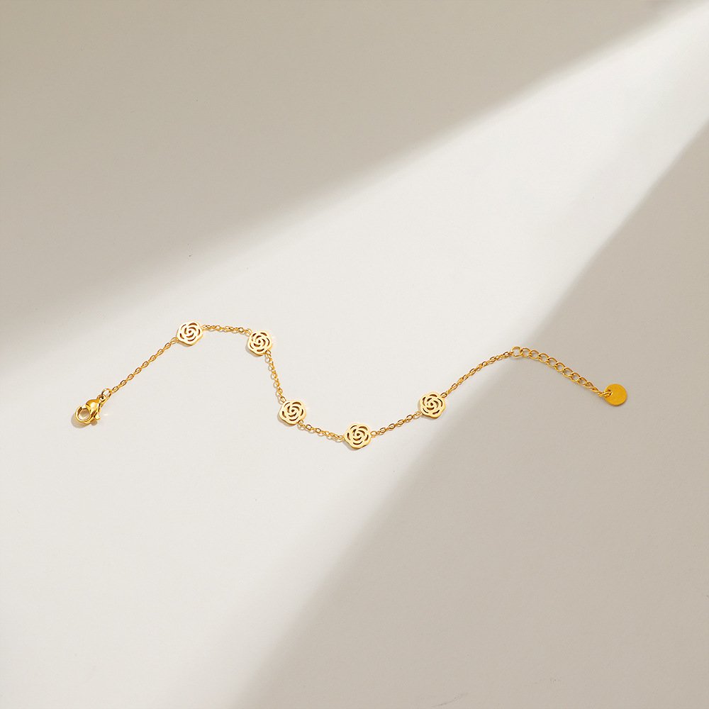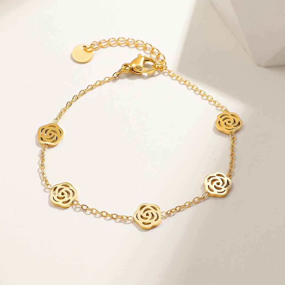 Rose station bracelet in 18K gold. Cutout floral charms on delicate chain. Adjustable romantic jewelry. Tarnish-free luxury!
