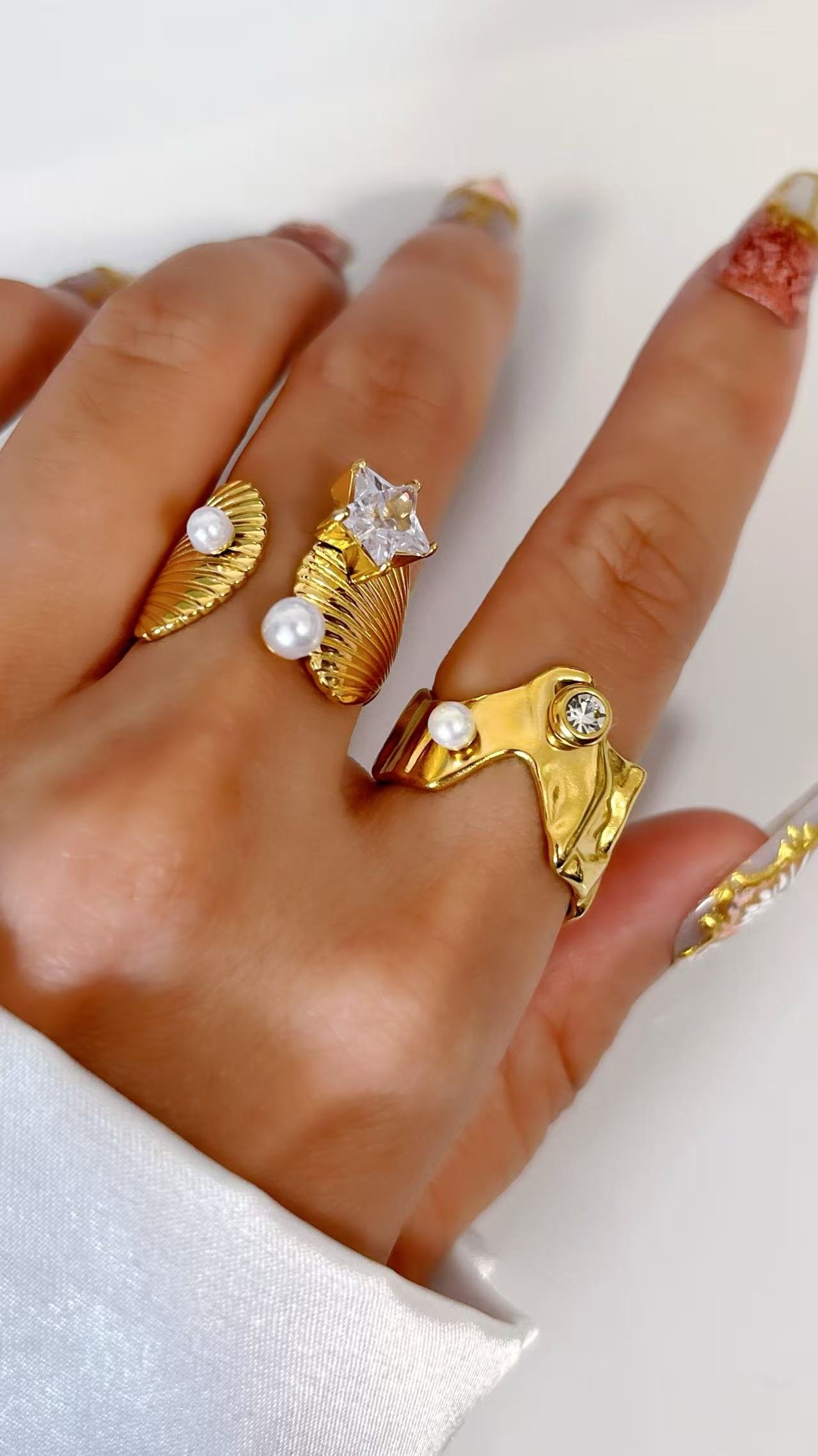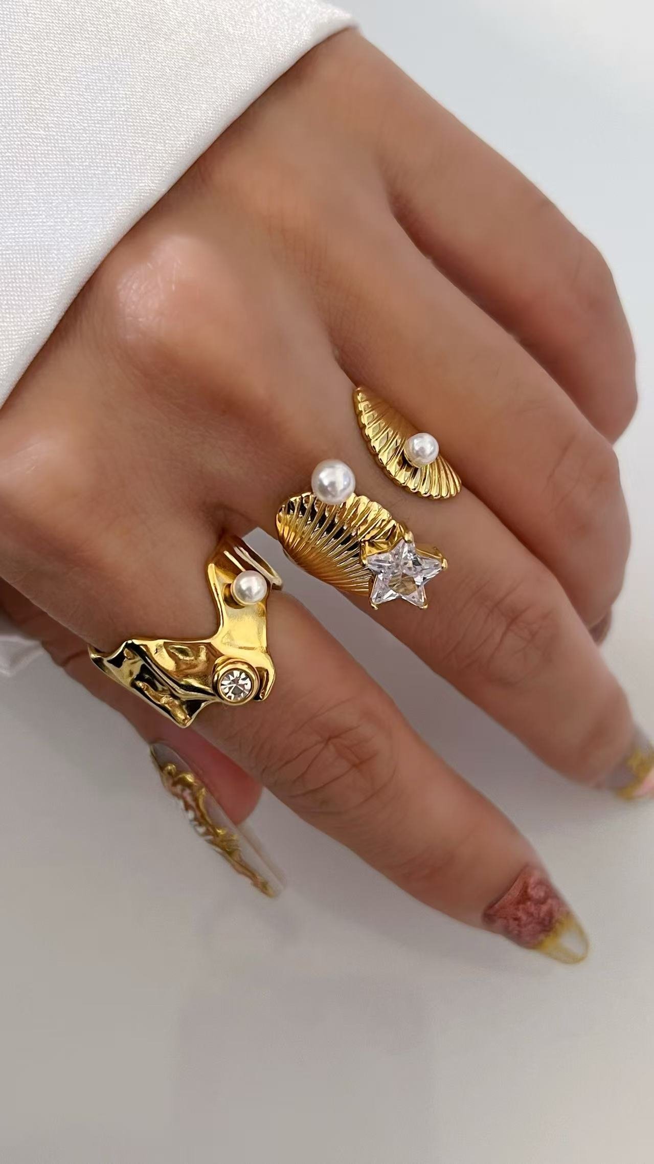 Seashell open ring with pearl & star zircon in 18k gold. Ocean-inspired design, adjustable fit, tarnish-free. Coastal jewelry. Shop HEYBIJOU!