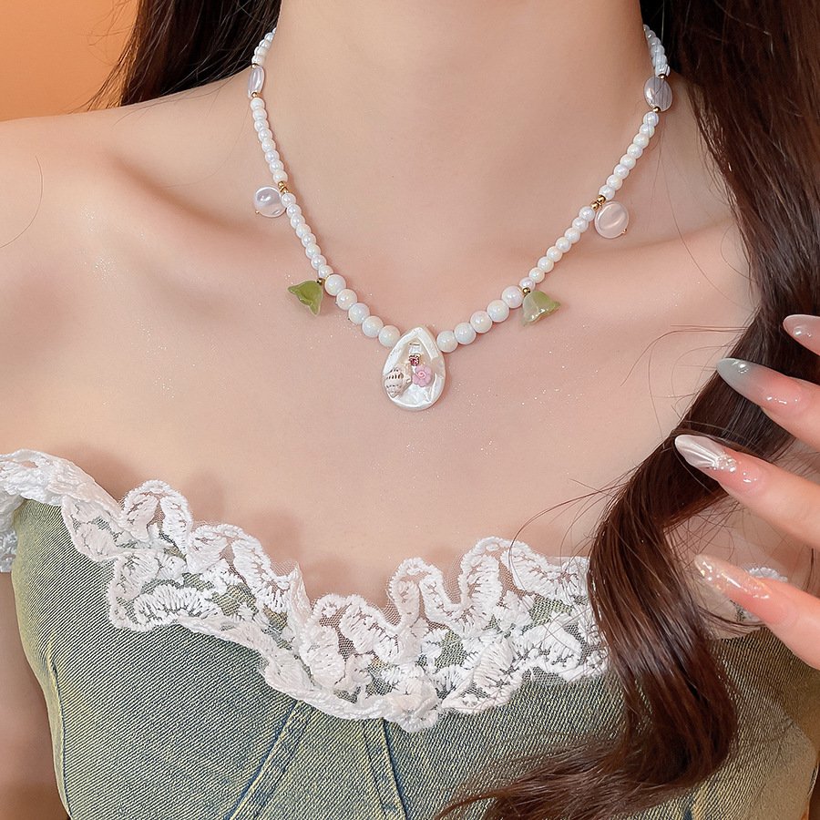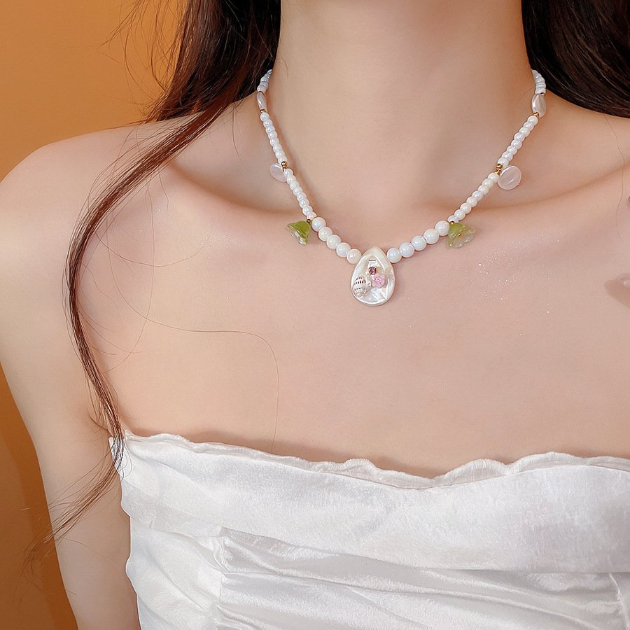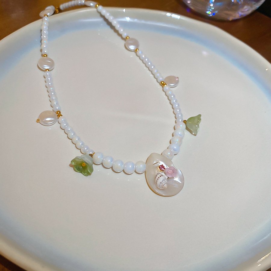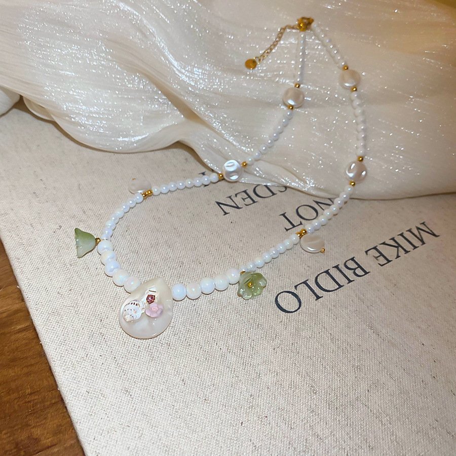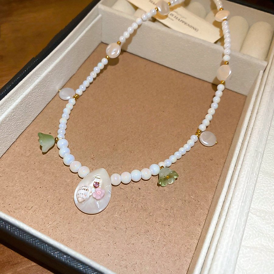 🌿 Texture, Color & Dimension — All in One What sets this necklace apart is its irresistible layering of textures: smooth round white stone beads, organic keshi-style shell pieces, soft green floral charm drops, and that breathtaking shell pendant at the centre. Together they create a palette of blush, white, sage, and gold that is effortlessly coastal, romantic, and refined.