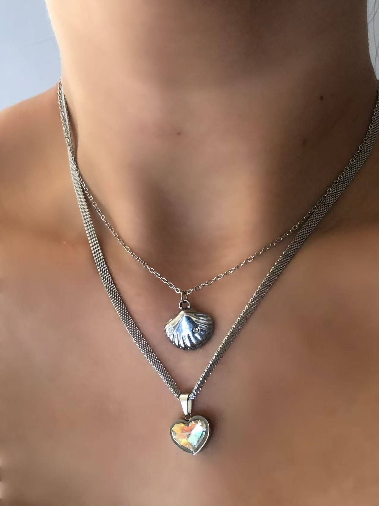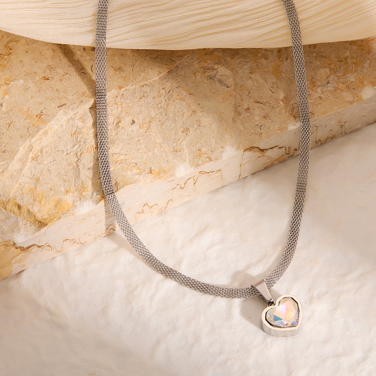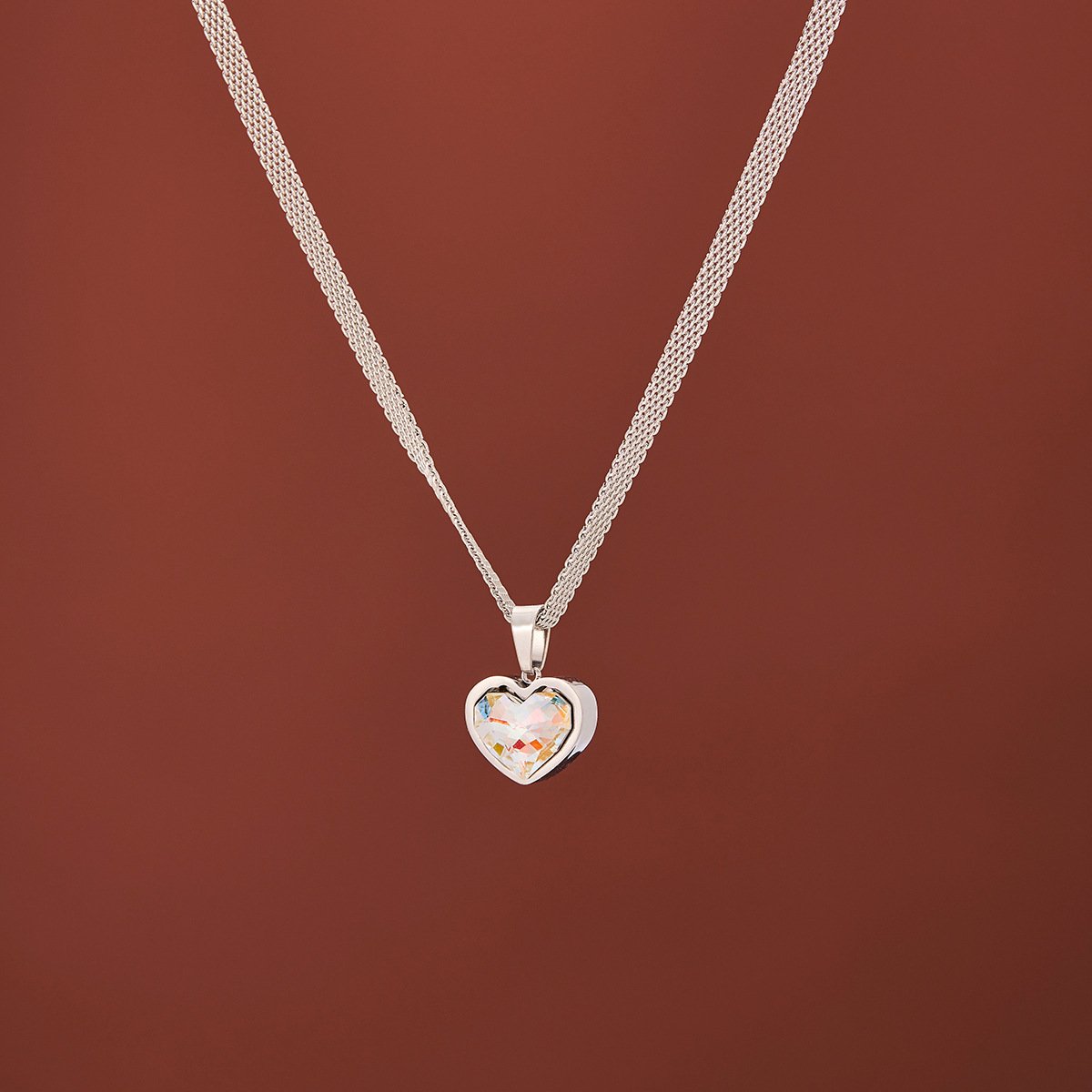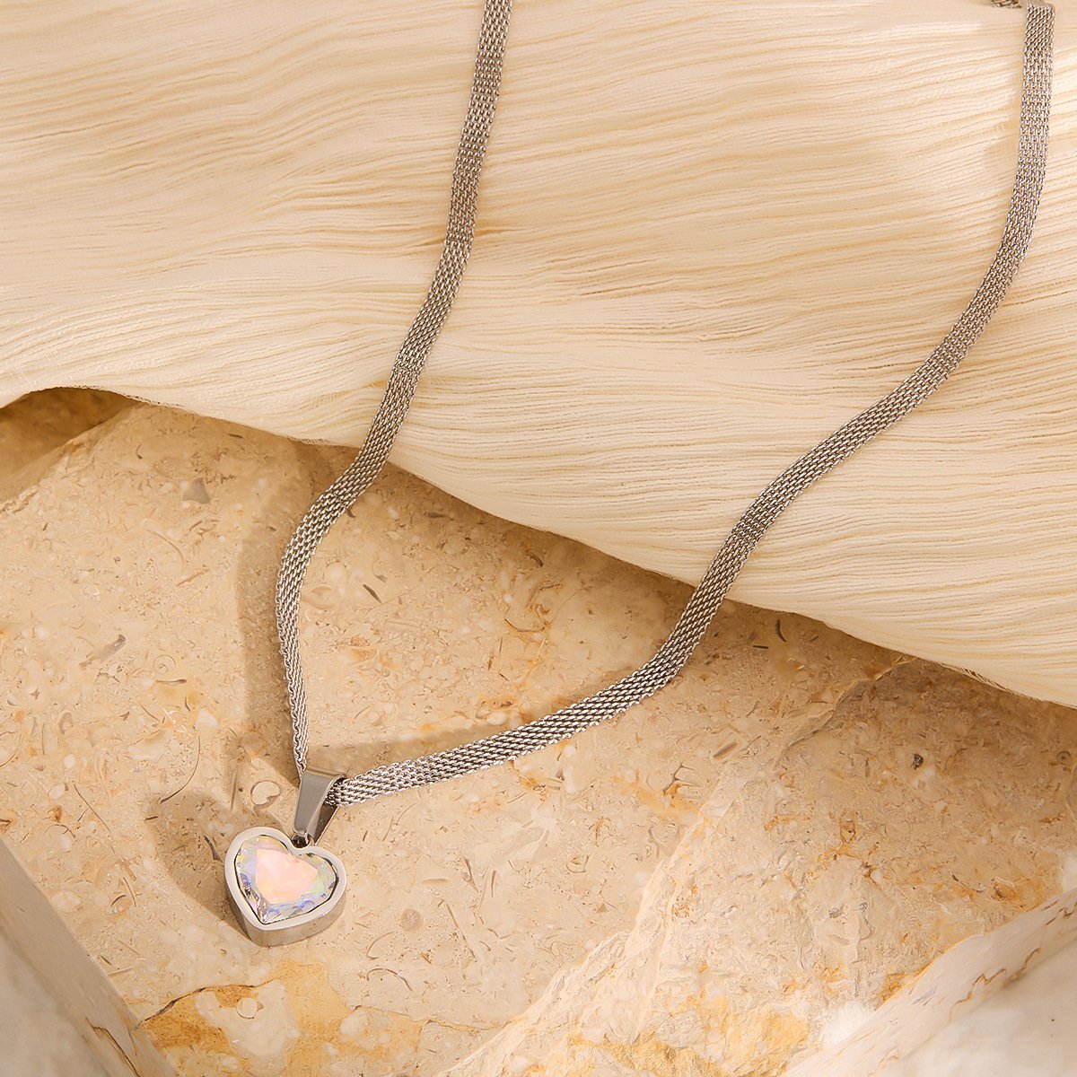 Fire opal heart necklace in silver! Rainbow crystal pendant on mesh chain. Tarnish-free titanium steel jewelry. Shop HEYBIJOU romantic collection!