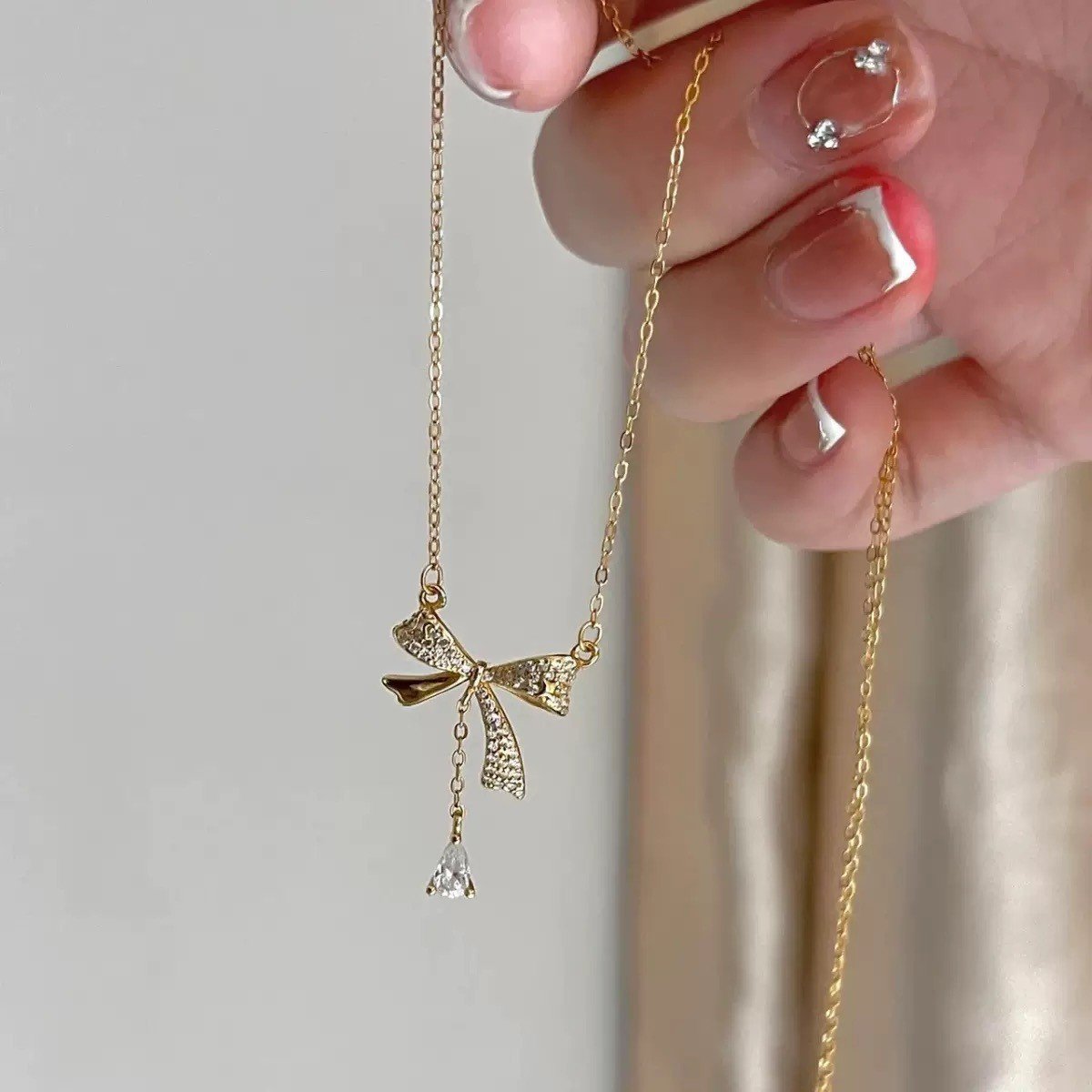 HEYBIJOU sparkling zircon bow necklace—elegant drop pendant in 18K gold or silver plated titanium steel. Tarnish-free, water-resistant romantic luxury!