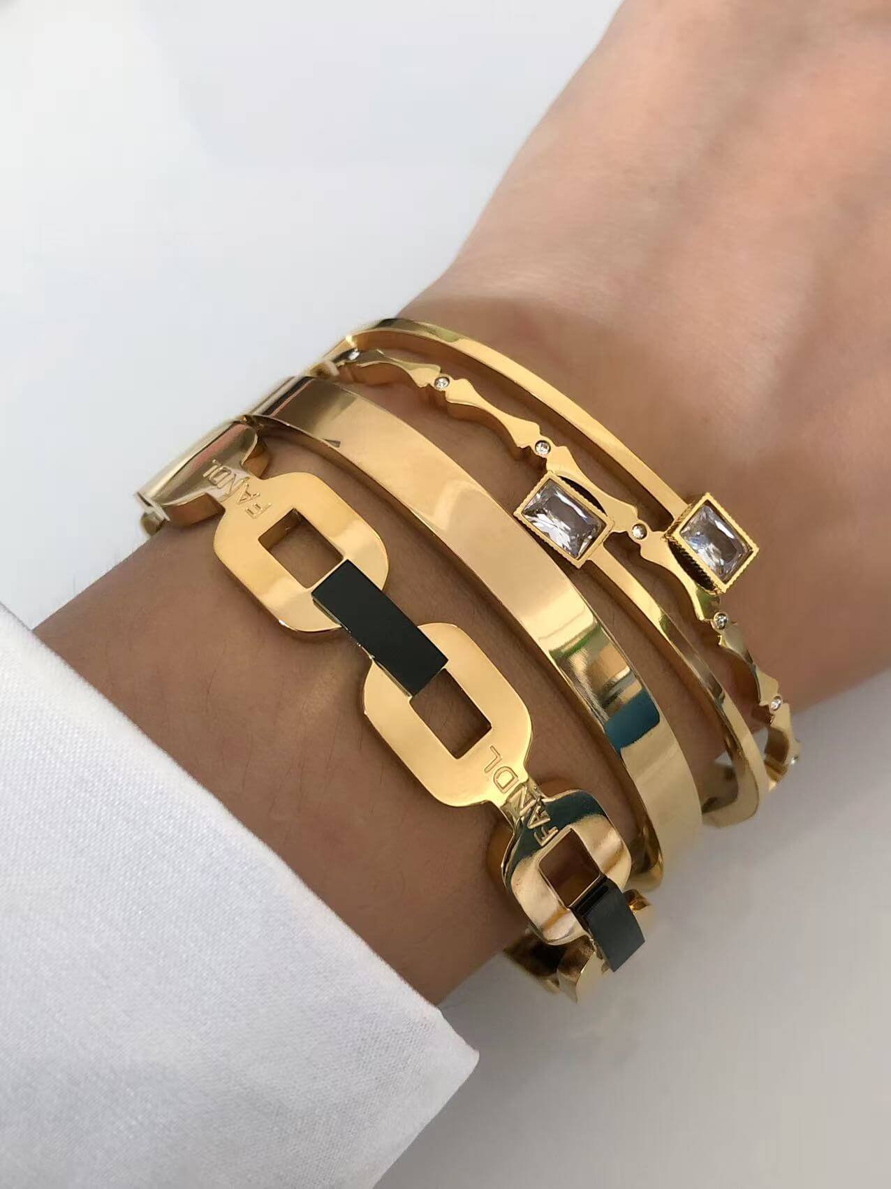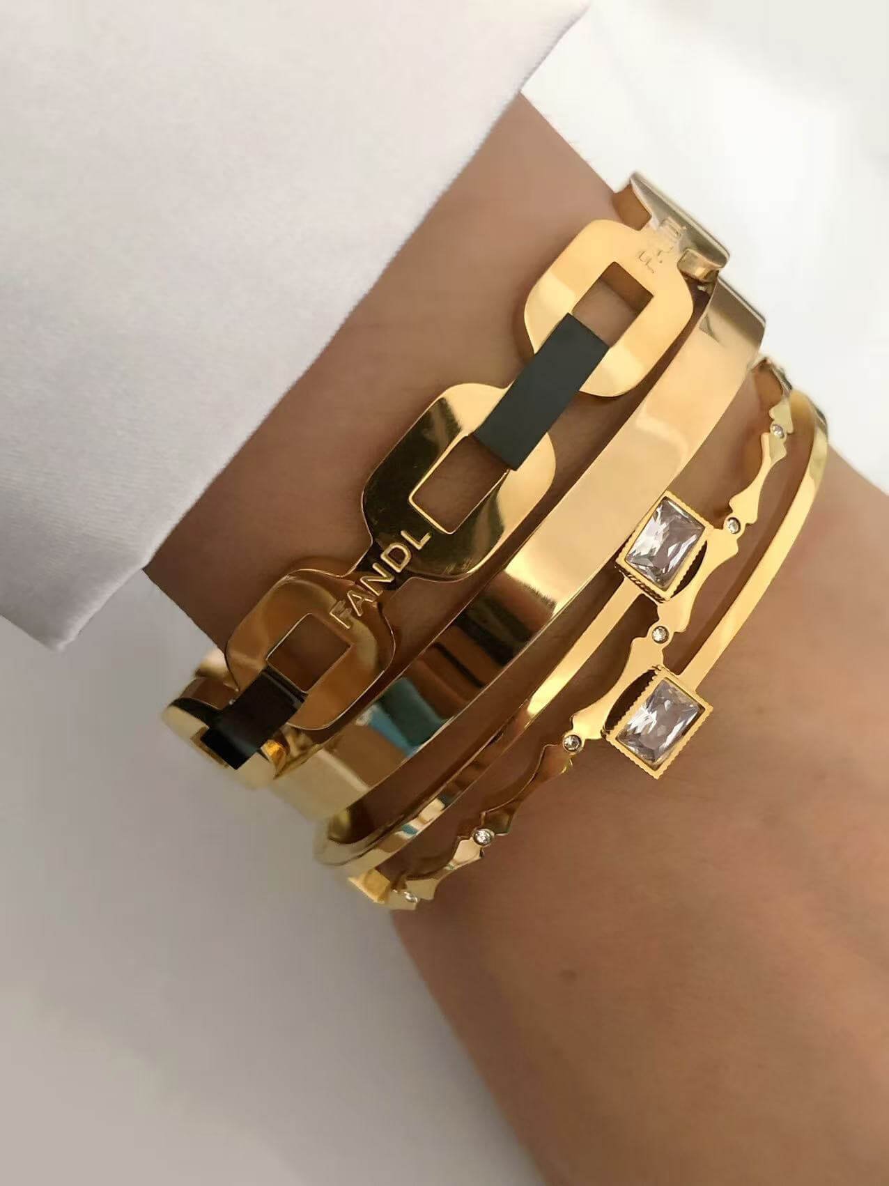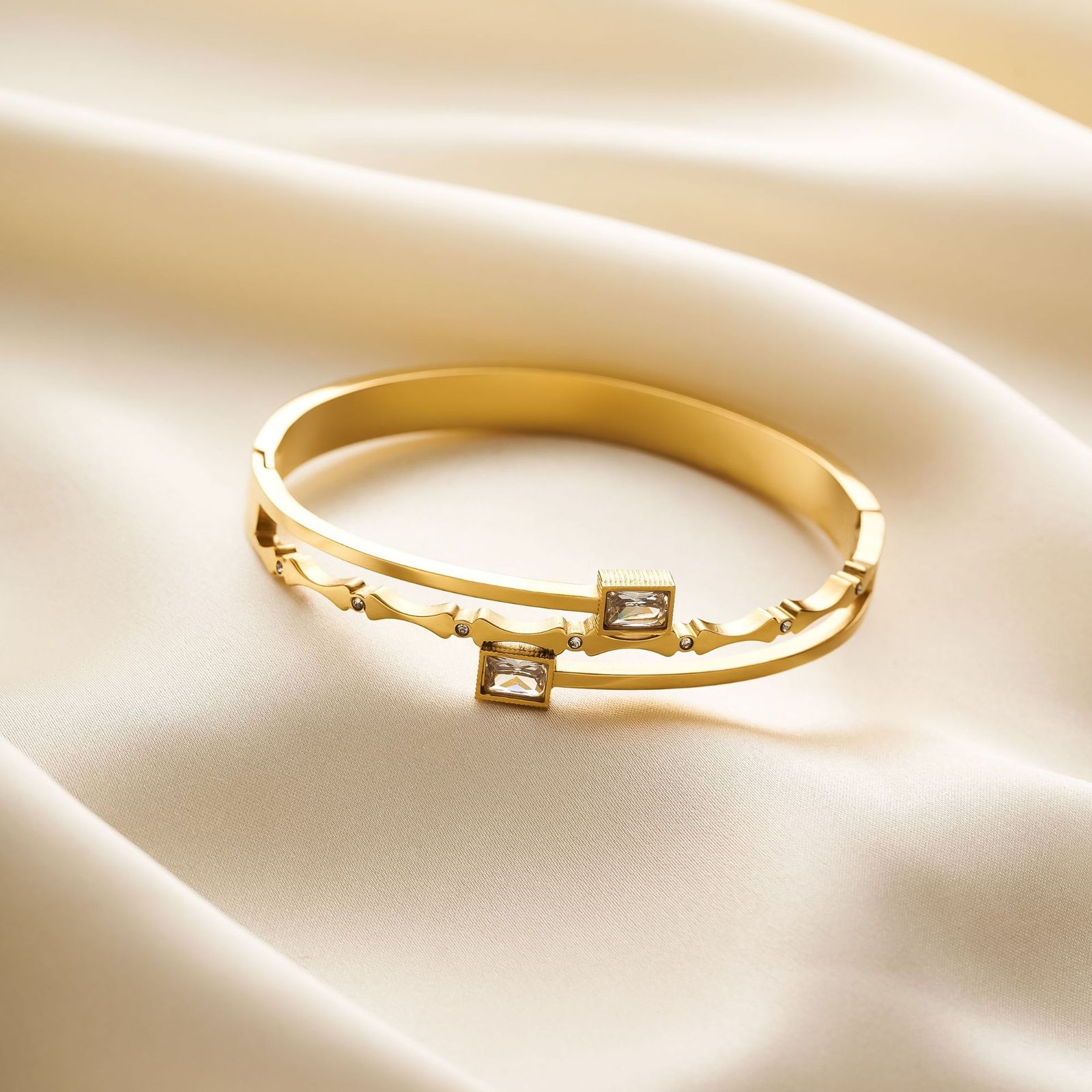 Stunning square crystal meteor bangle in 18k gold titanium steel. Geometric celestial jewelry, tarnish-free design. Shop HEYBIJOU cosmic style!