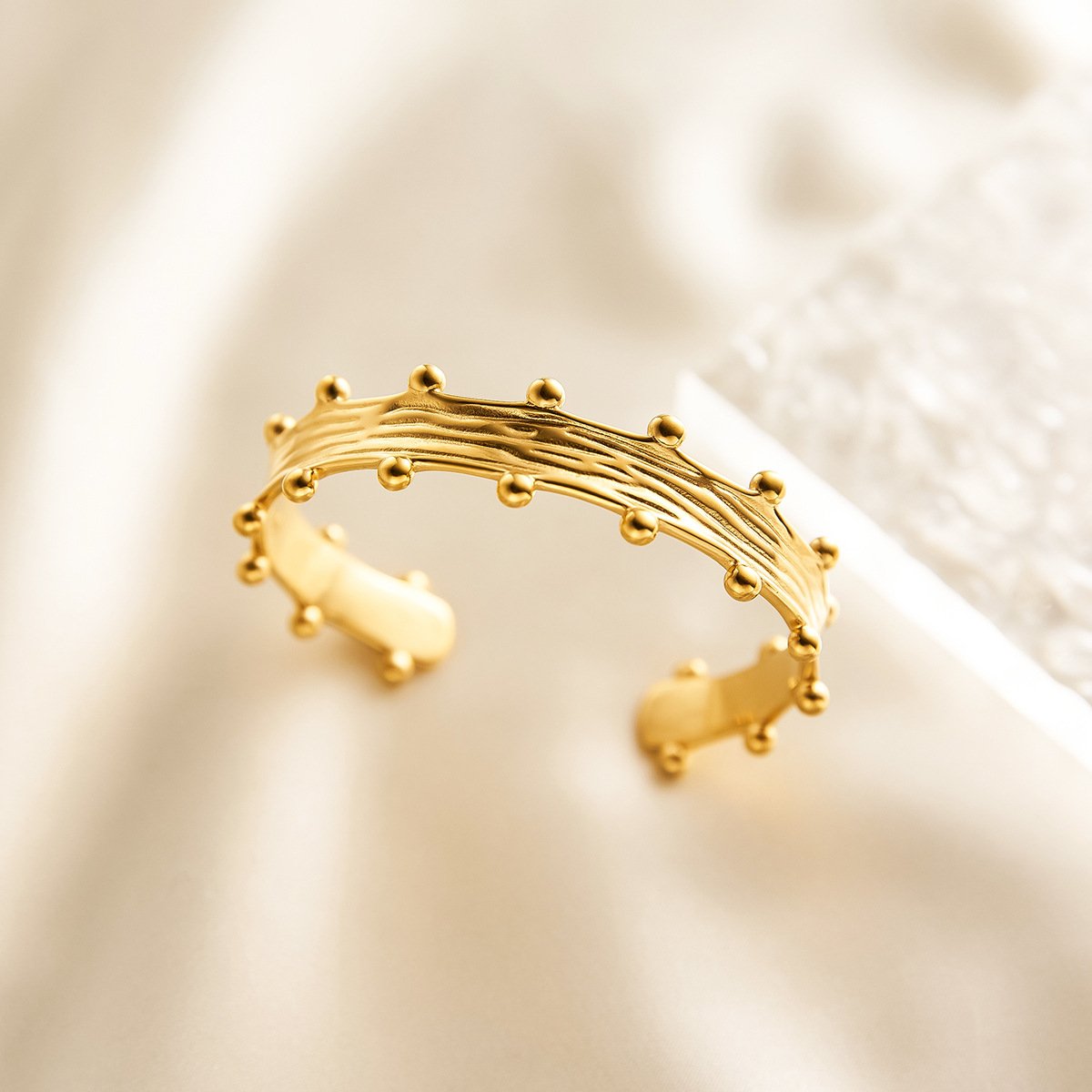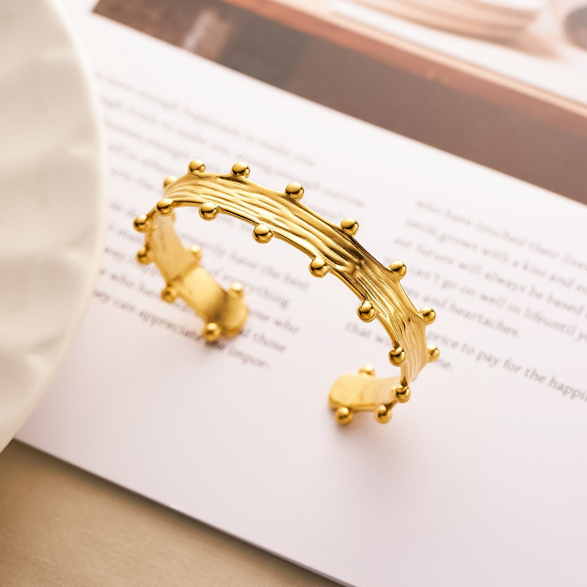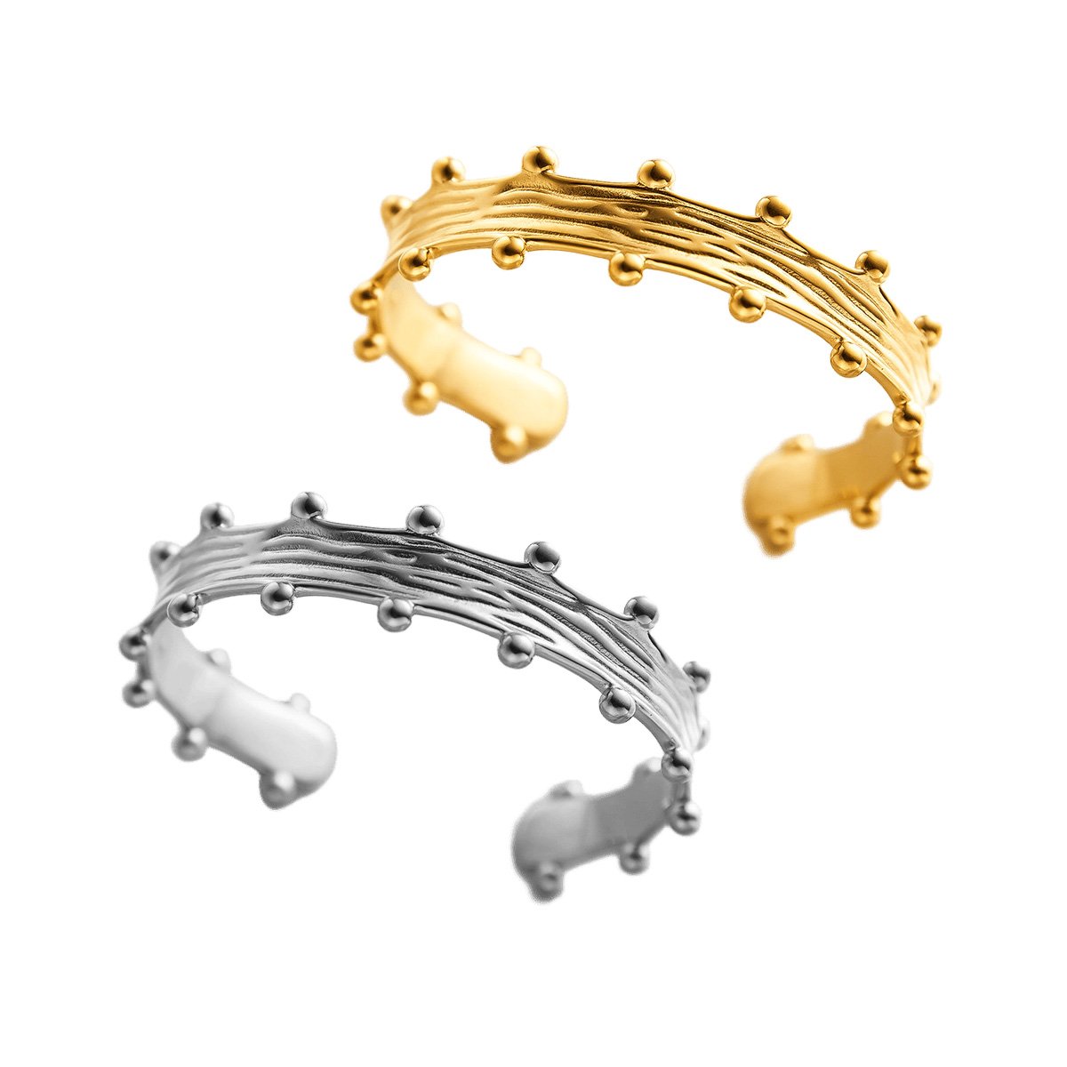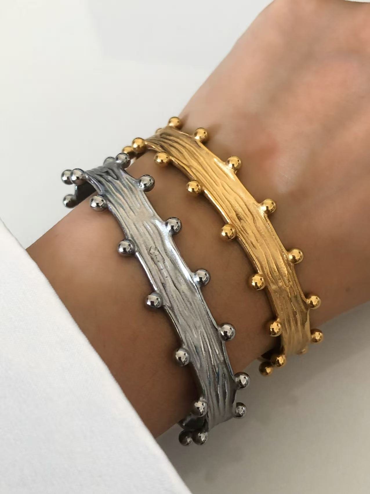 Stunning 18k gold/silver studded wire cuff bracelet. Tarnish-free, water-resistant. Modern sculptural design meets timeless elegance. Shop HEYBIJOU now!