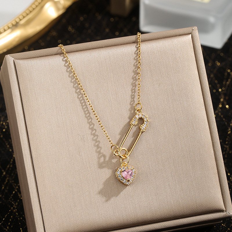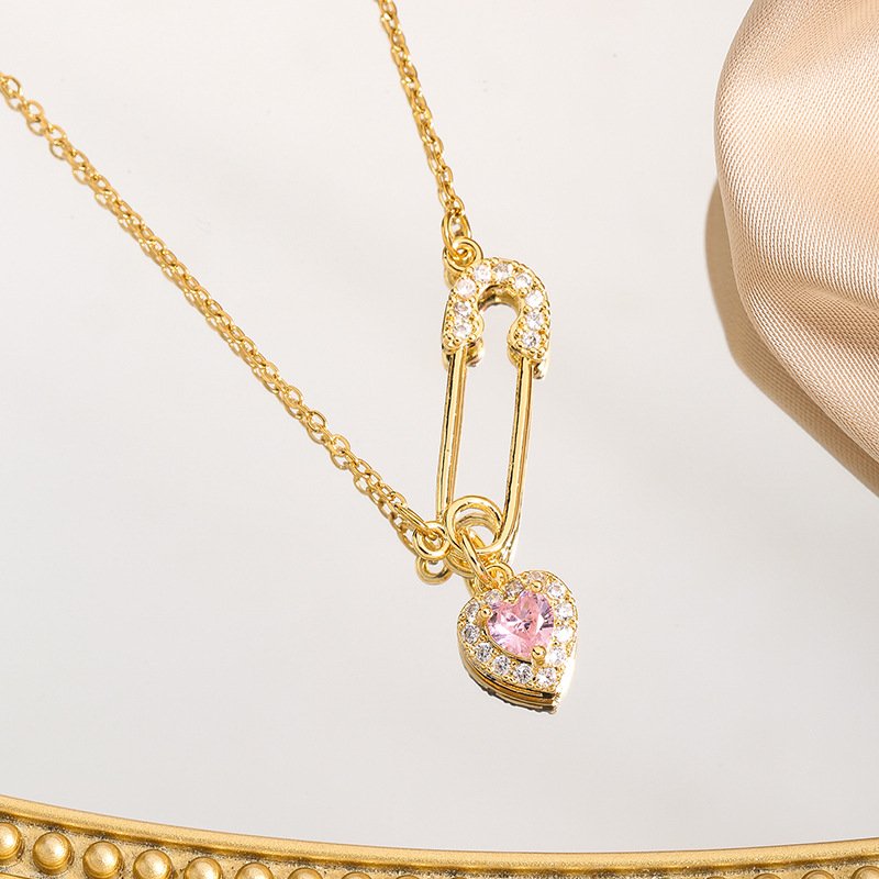 A playful 18K gold plated necklace with a sparkling pink heart zircon and safety pin design—modern, elegant, and full of charm.