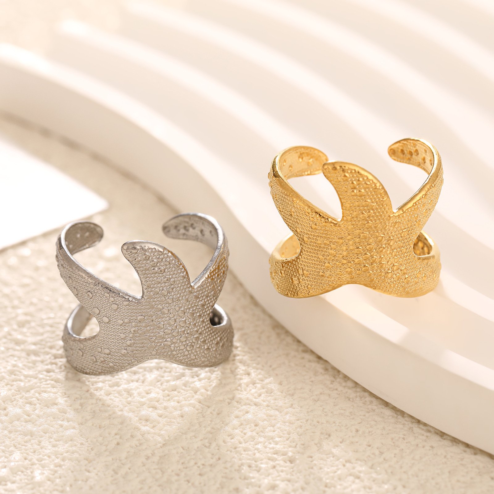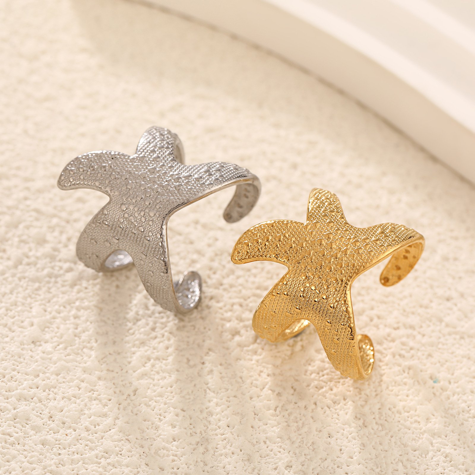 Glow with ocean vibes in our tarnish-free Golden Textured Starfish Open Ring—18K gold-plated titanium, realistic bumpy texture for bold seaside luxury!