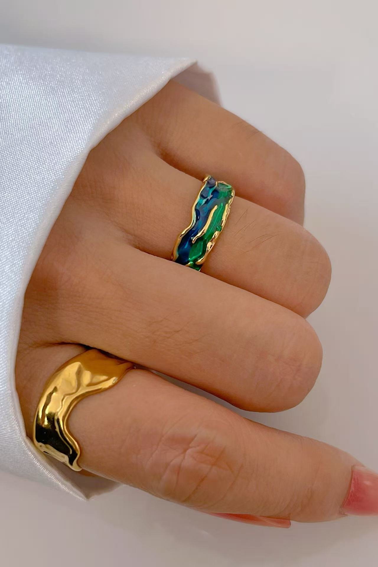 HEYBIJOU’s Tidal Mirage Enamel Wave Cuff—18K gold titanium open ring with swirling ocean inlays. Tarnish-free, waterproof allure for fingers riding endless tidal dreams!