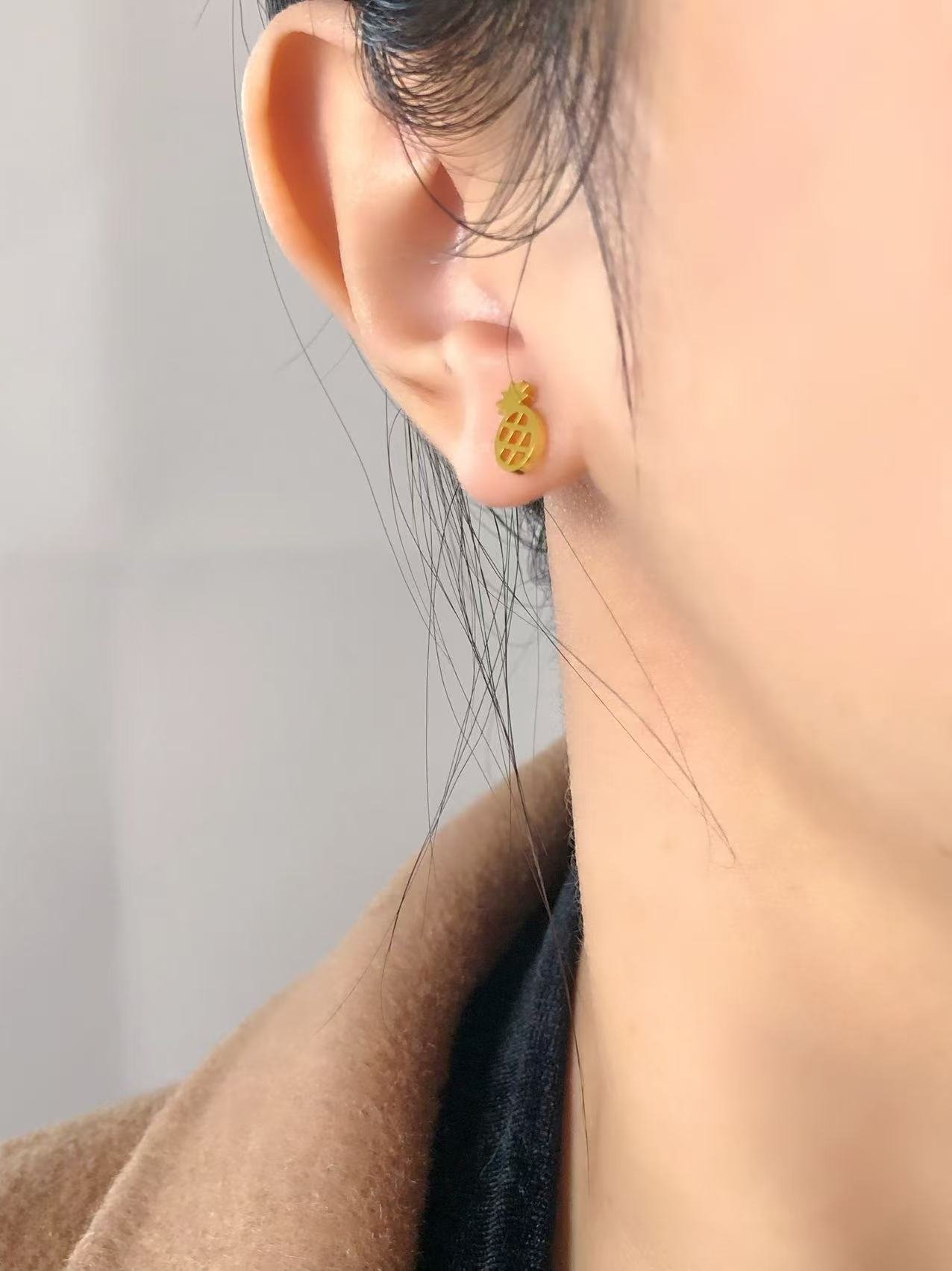 Tiny gold pineapple stud earrings in 18k gold. Cute tropical cutout design, tarnish-free & water-resistant. Fun summer jewelry. Shop HEYBIJOU!