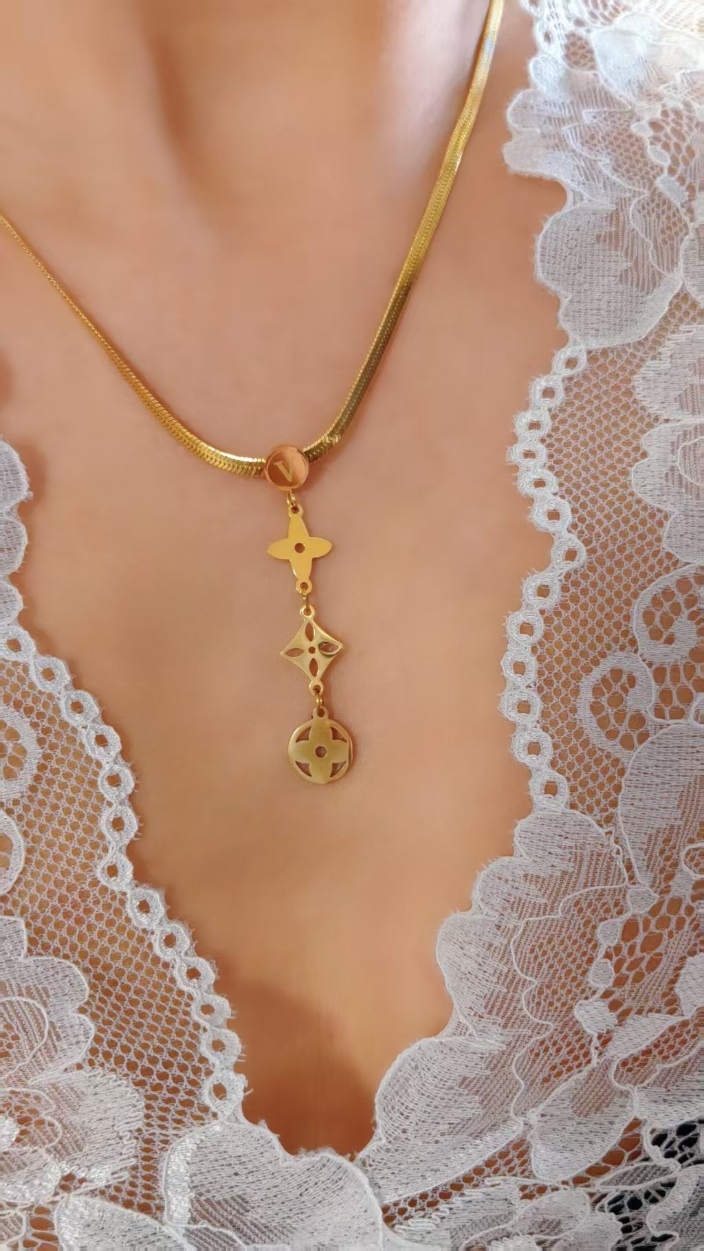 Introducing the HEYBIJOU Triple Charm Lariat Necklace — a necklace that earns its place at the absolute center of every outfit. A wide, flat gold herringbone snake chain frames the neck in liquid gold, while a cascading three-tiered pendant drop hangs from a smooth round disc connector — three distinct geometric clover shapes linked one beneath the other in a long, swaying vertical drop that commands the entire chest. Architectural, editorial, and completely captivating from every angle.