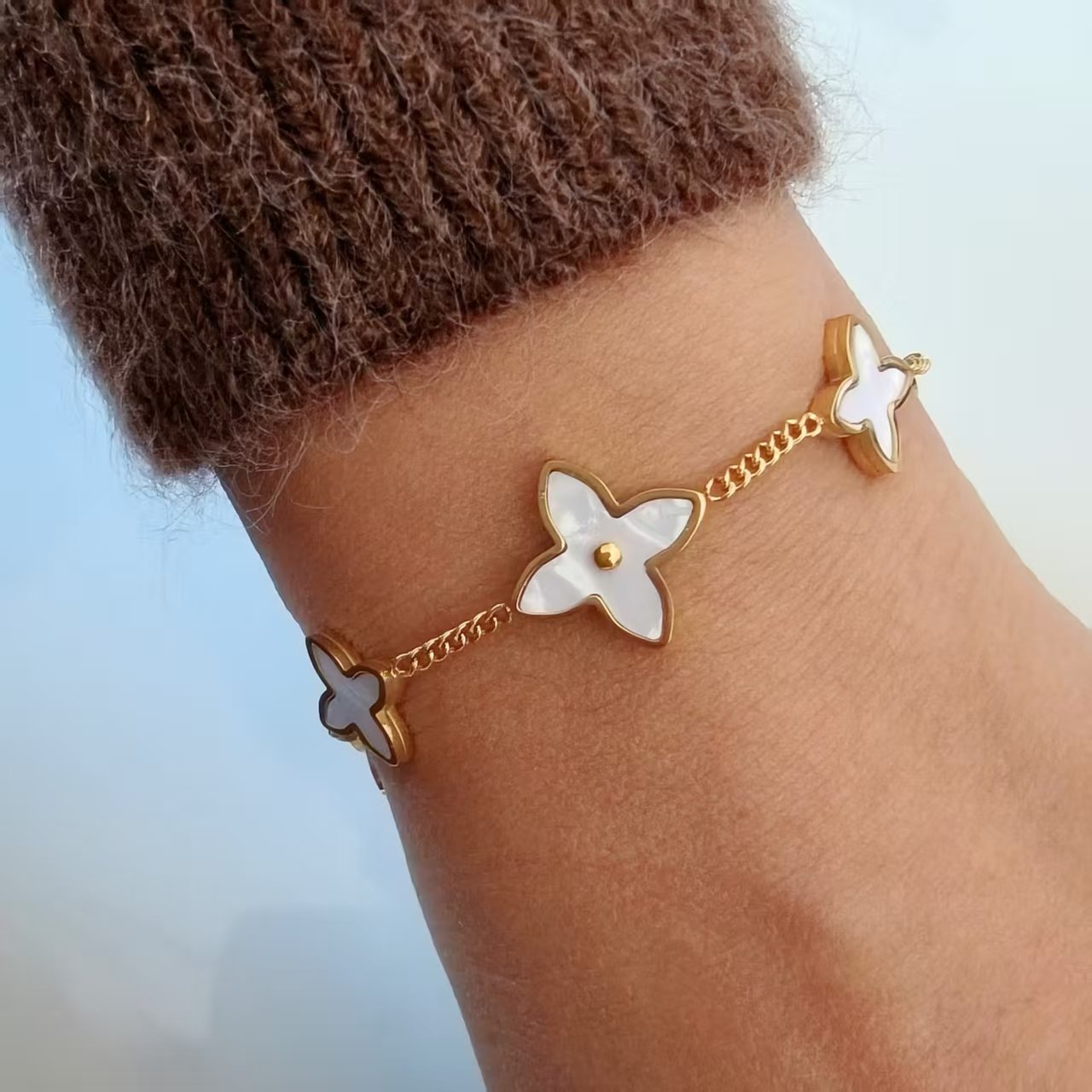 HEYBIJOU triple clover shell bracelet—iridescent white shell stations in 18K gold or silver plated titanium steel. Tarnish-free, water-resistant lucky luxury!