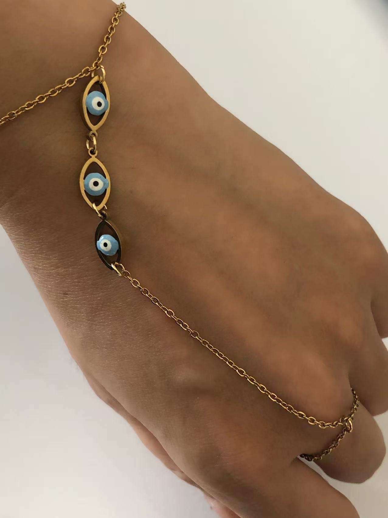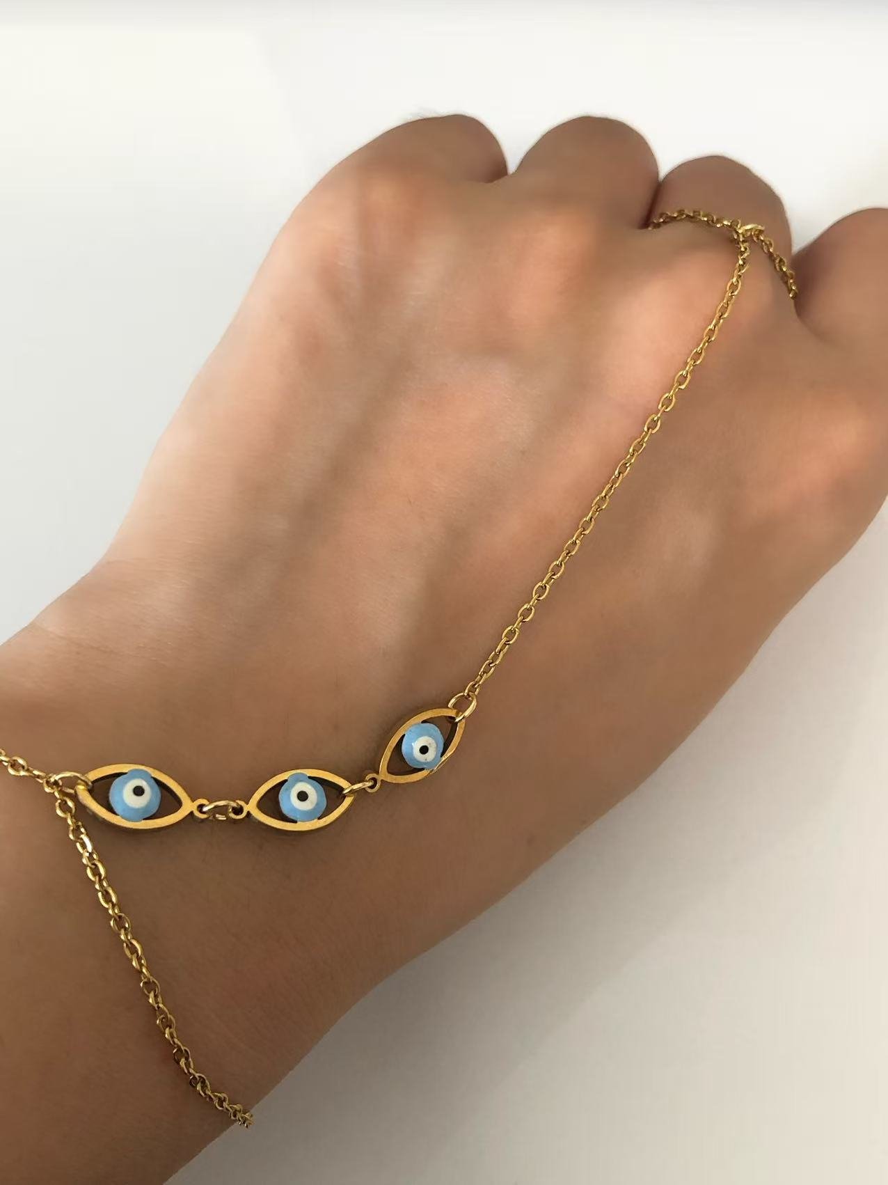 👁️Triple Evil Eye Hand Chain – 18K Gold Plated, Enhanced Protection Bracelet. Sacred jewelry with adjustable fit & tarnish-free!