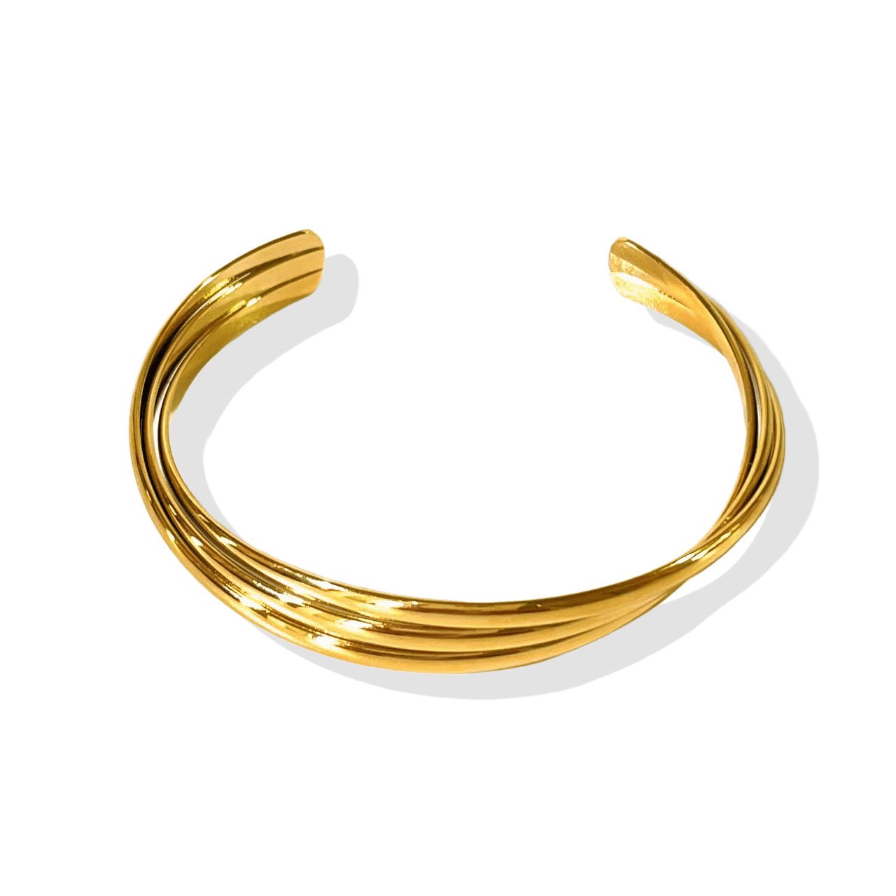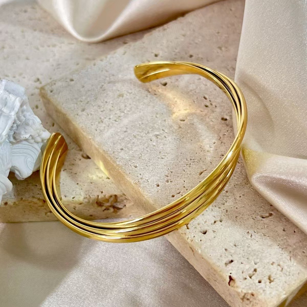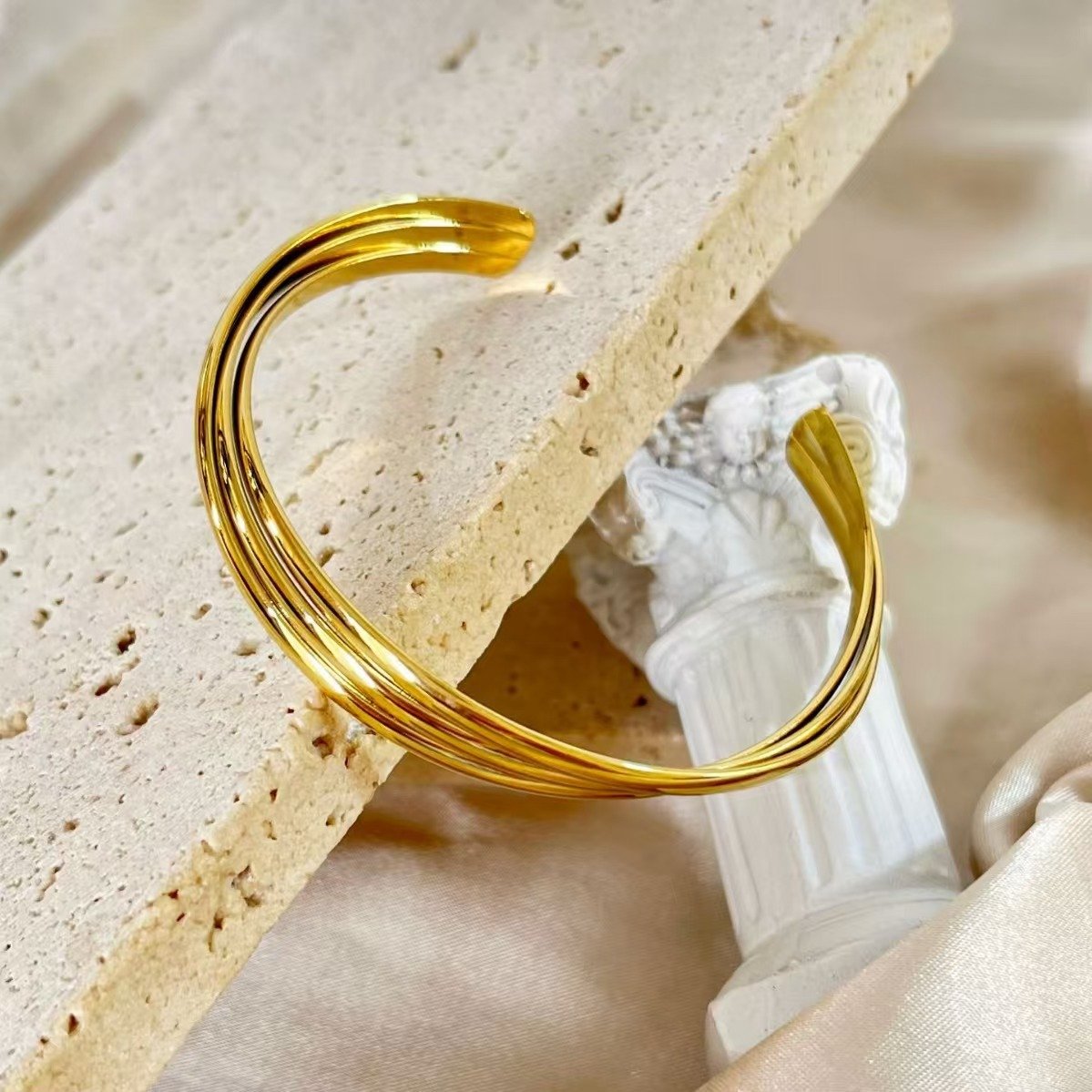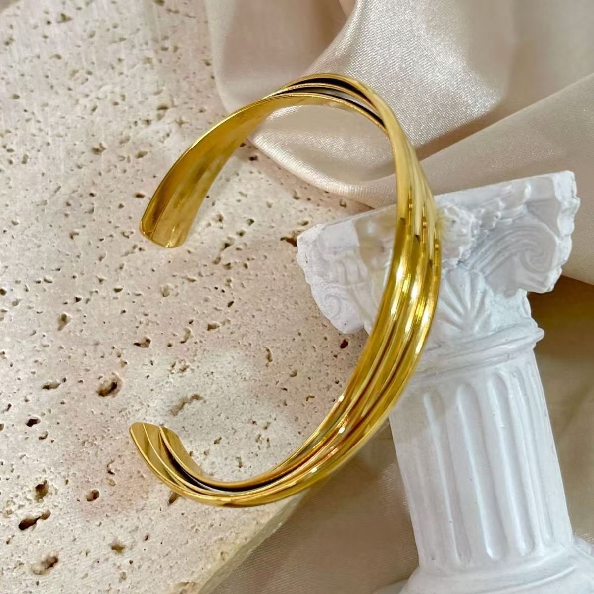 HEYBIJOU triple layer gold cuff bangle—sleek 18K gold-plated titanium steel crossover design. Tarnish-free, water-resistant luxury that turns heads!