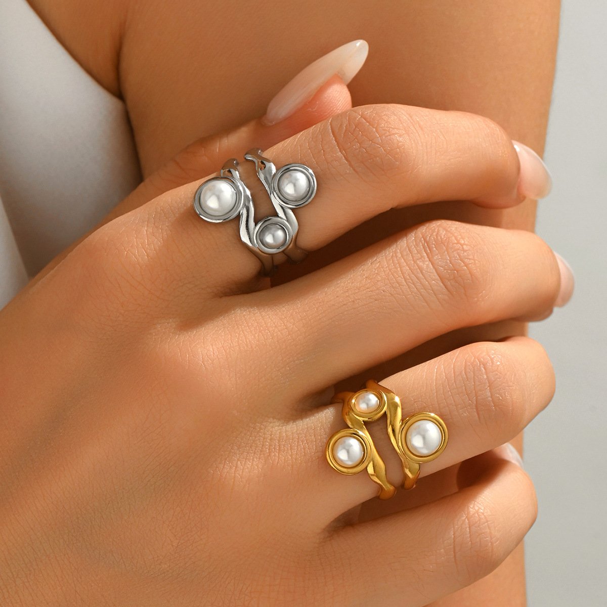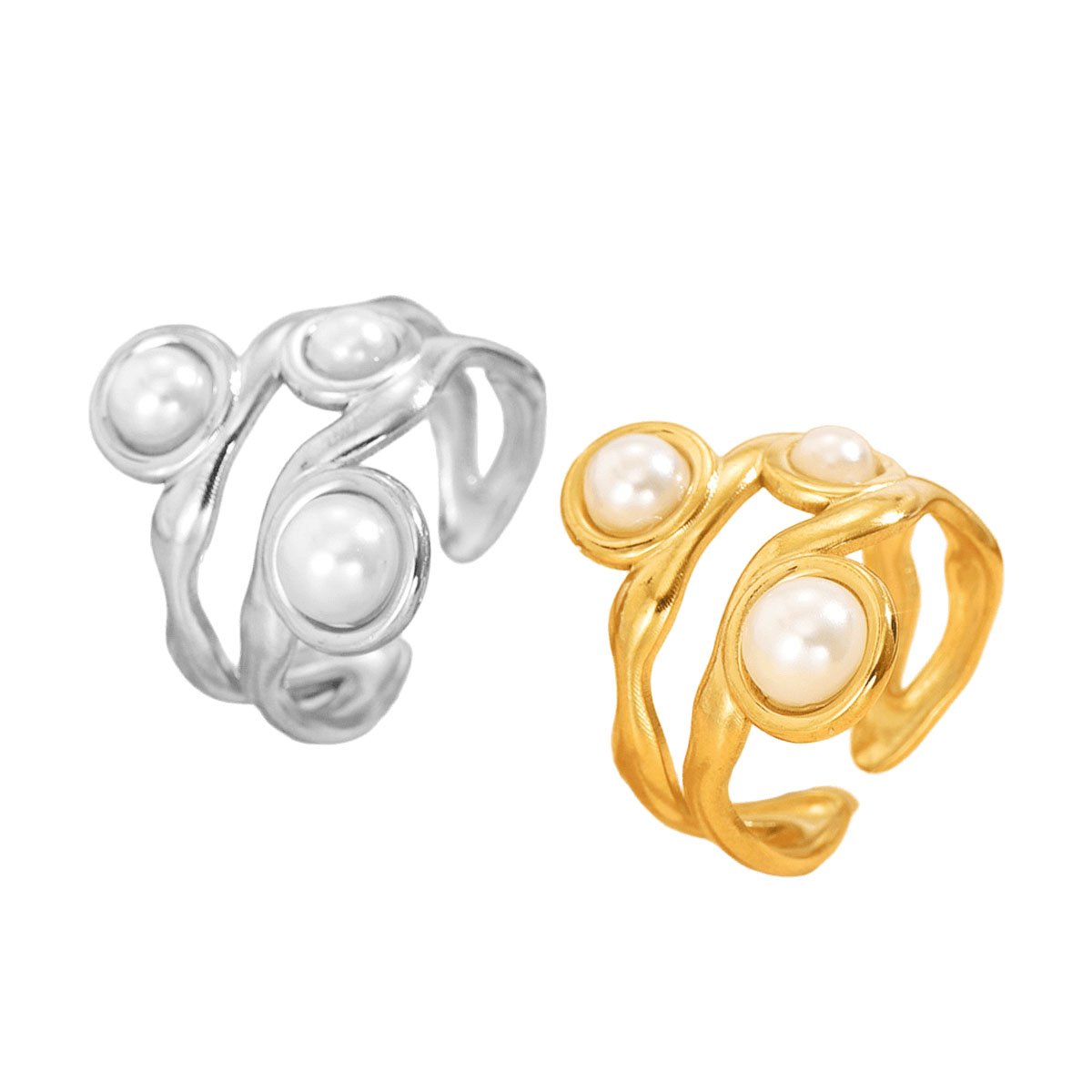 Triple pearl twist ring with flowing bands. Adjustable 18K gold or silver titanium steel. Tarnish-free & water-resistant elegance! 💍✨