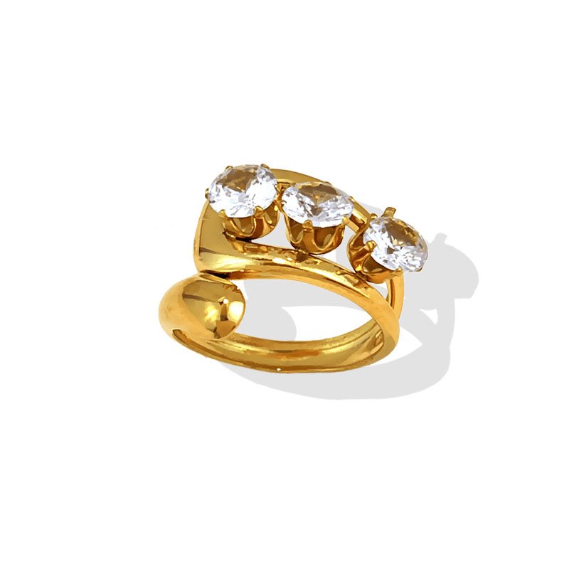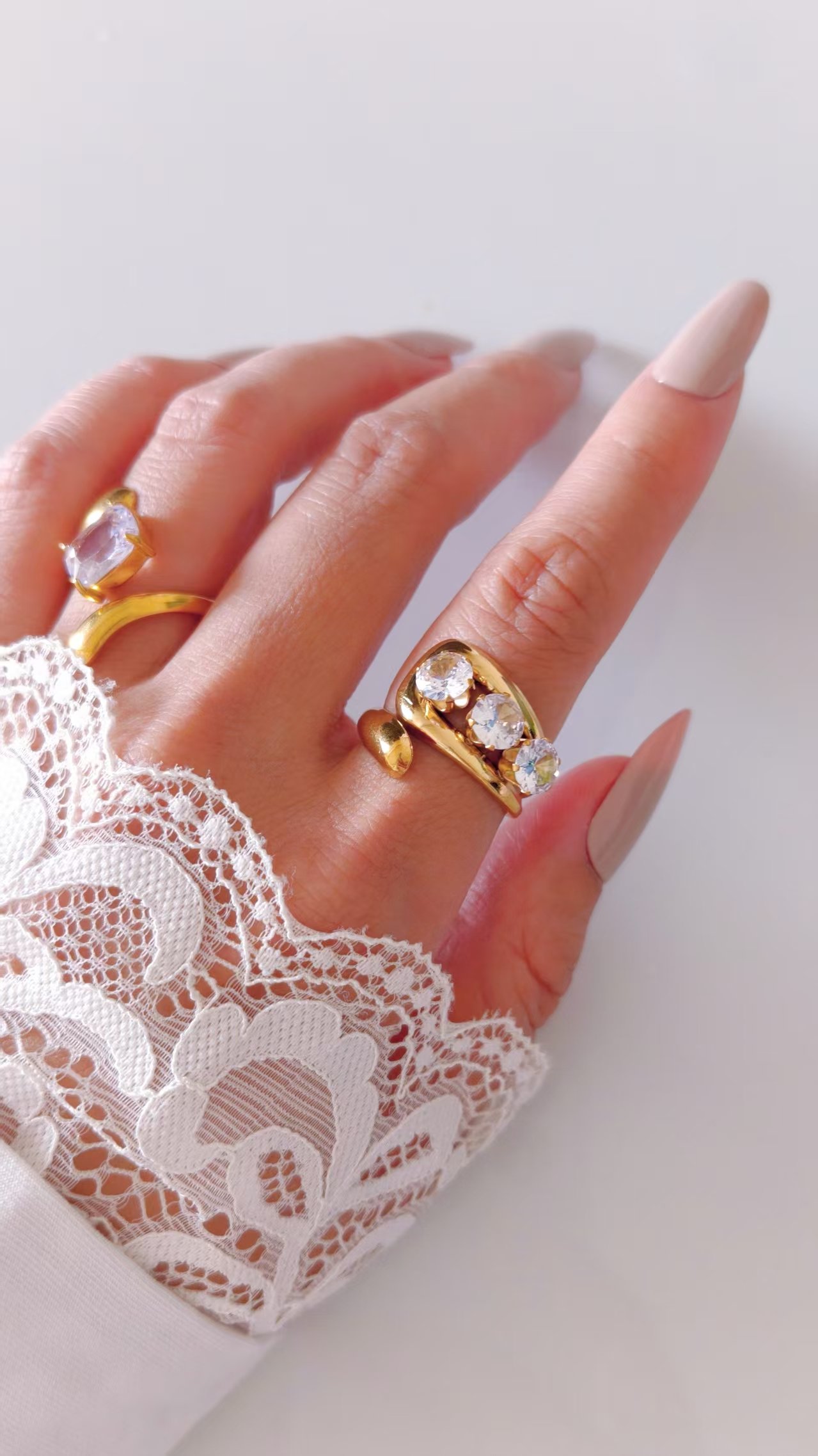 Why settle for one when three say so much more? Each sparkling clear zircon is prong-set in a sculptural gold cradle, catching light from every angle. The trio arrangement creates a dynamic, eye-catching flow that mimics the look of a high-end diamond eternity ring — at a fraction of the cost, with zero compromise on presence.