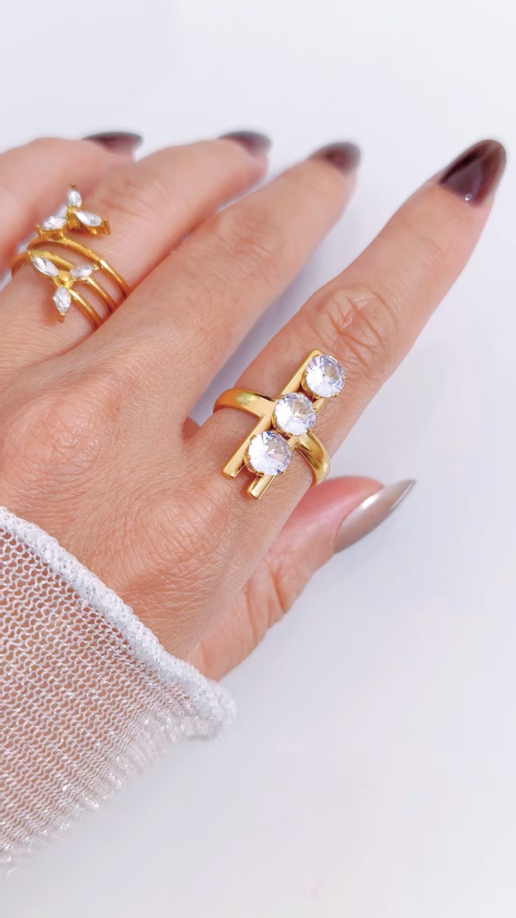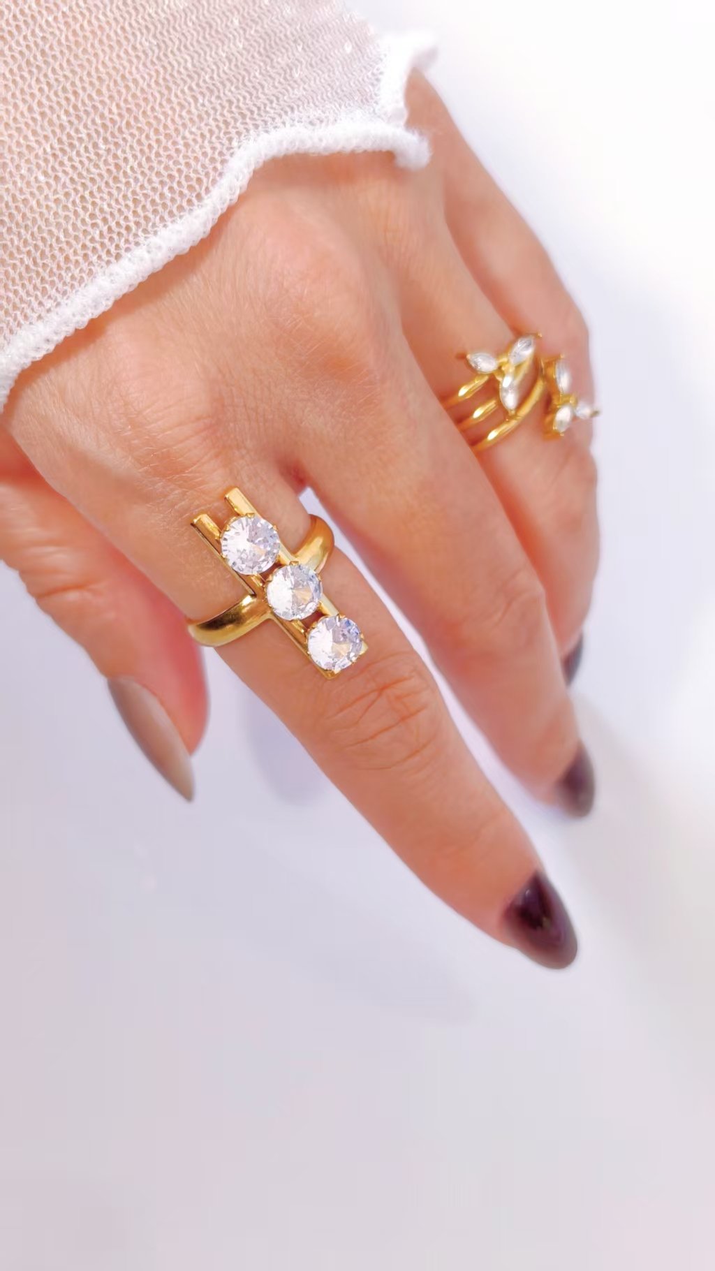 🔥 Stacked to Last. Stacked to Impress. Three stones of pure brilliance, set in titanium steel beneath a warm 18K gold finish — built to hold every prong, every facet, and every flash of light in perfect form indefinitely. Fully tarnish-free and water-resistant, this ring is your go-to everyday jewel that requires zero maintenance and delivers maximum impact. Adjustable back for a comfortable, customized fit on any finger.