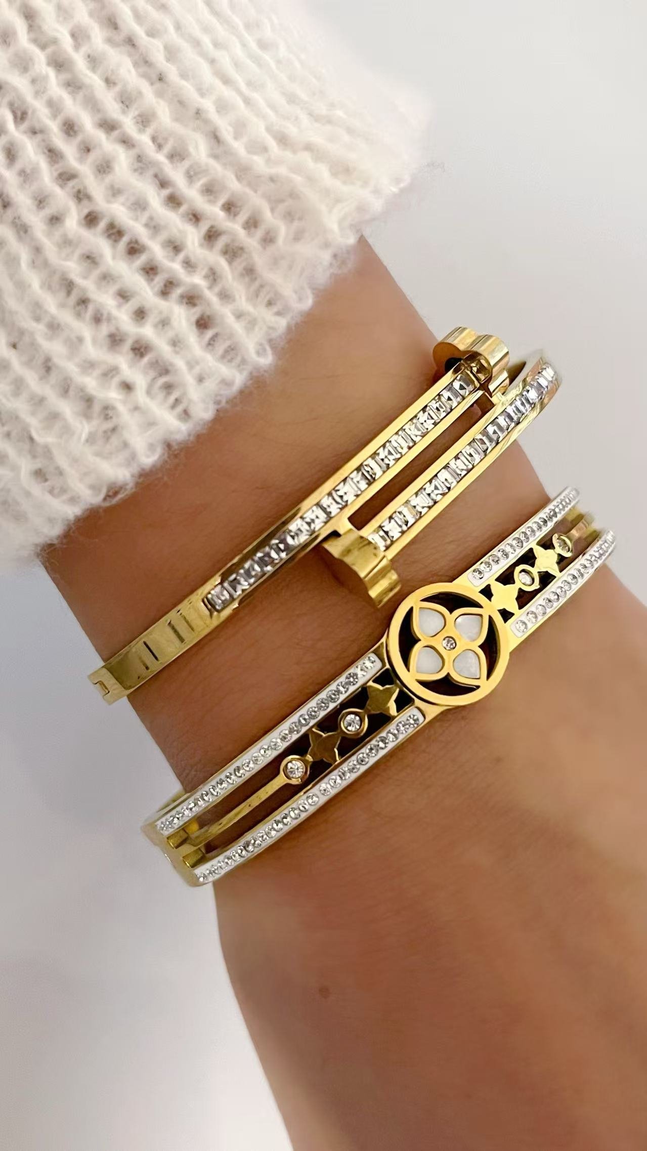 Elegant titanium steel bangle with dual clover tips and zircon inlay, available in 18K gold or silver plating. Hypoallergenic, durable, and beautifully refined.