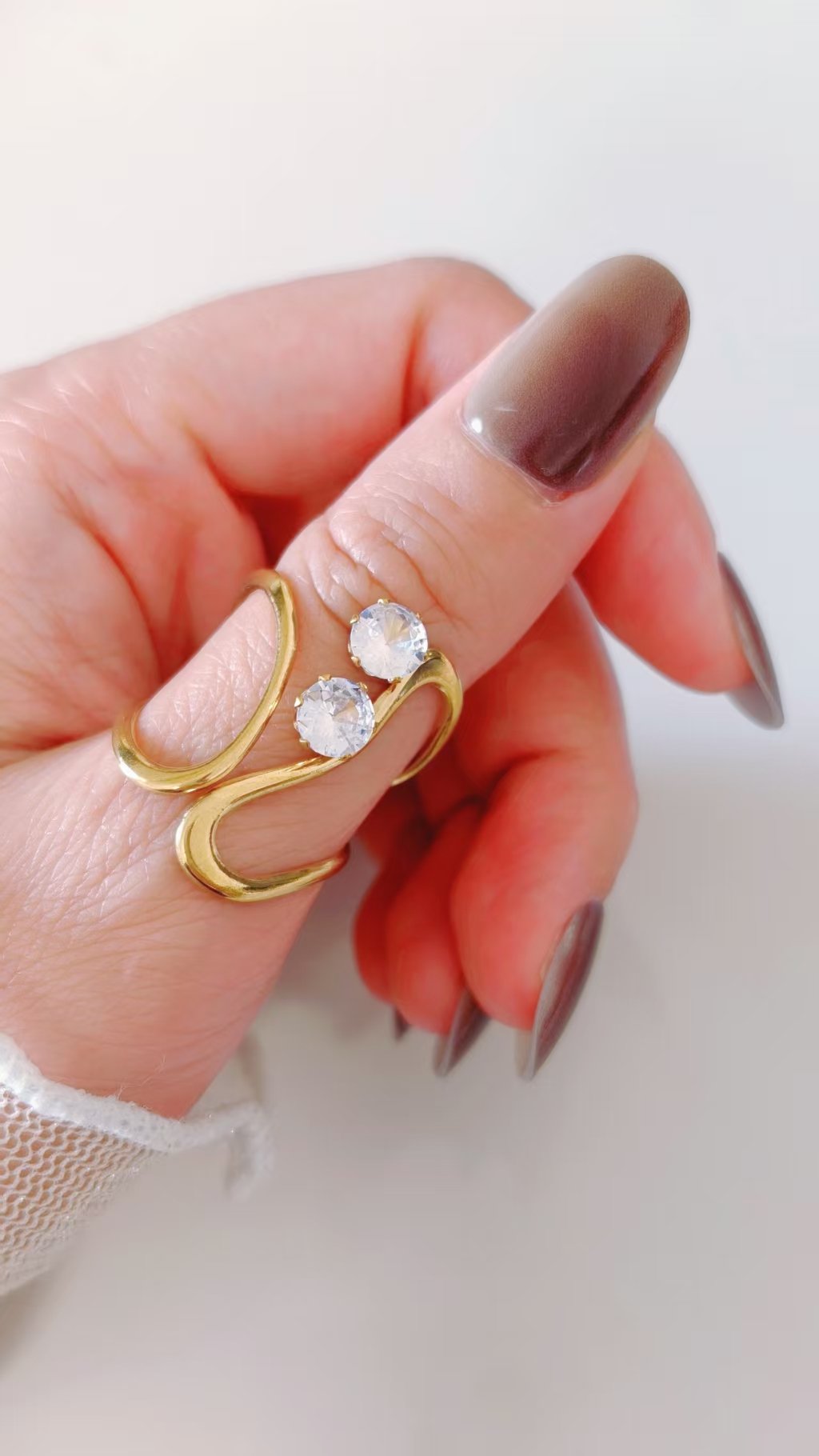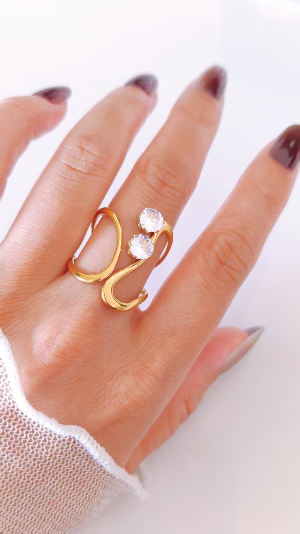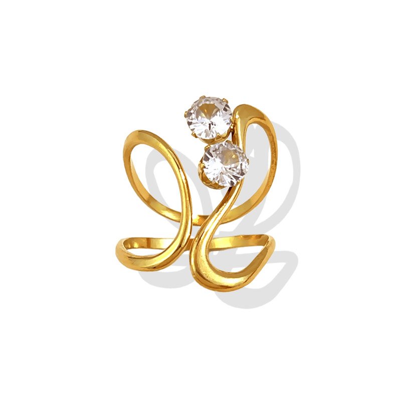 💎 Where Flow Meets Flash The body of this ring is a masterpiece of fluid design. Two continuous gold lines sweep outward from the band in wide, looping curves — crossing and uncrossing in a graceful figure-of-eight formation that creates generous open negative spaces, giving the ring an almost architectural lightness despite its bold 2.6cm presence. The lines converge at the top where two generously sized round-cut zircon stones are nestled in prong settings side by side — one slightly elevated above the other — like two brilliant dewdrops perched at the peak of a golden wave. The contrast between the smooth, unadorned sculptural gold body and the pure, bright sparkle of the twin zircons is deeply satisfying — restrained where it needs to be, brilliant exactly where it counts.