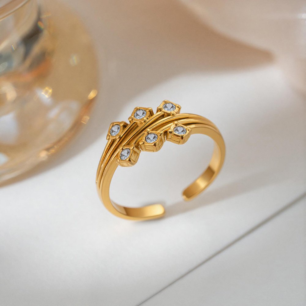 Triple rail gold ring with 6 bezel zircons — adjustable, architectural & bold. Tarnish-free & water-resistant. Speed meets sparkle. ⚡✨