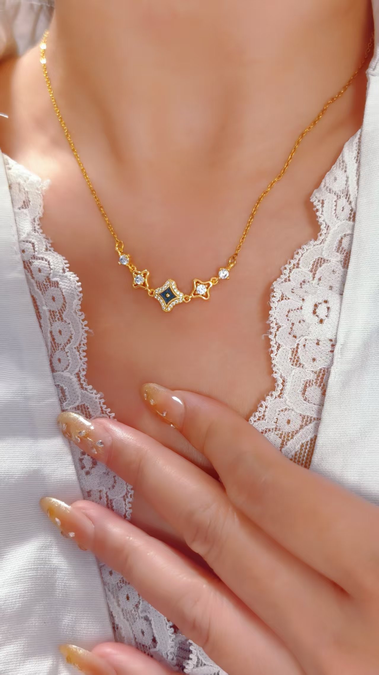 Picture the sky at its darkest, most velvety hour — when stars burn brightest against the black and everything feels a little more alive. That is the exact feeling the Velvet Sky Necklace from HEYBIJOU captures and crystallizes into a pendant you wear against your skin every single day. A black mother of pearl diamond star anchors the center, its deep lustrous surface rimmed with pavé zircon fire, flanked by two open star outlines and a cascade of solitaire sparkle that trails up toward the chain. Celestial. Mysterious. Breathtakingly beautiful.