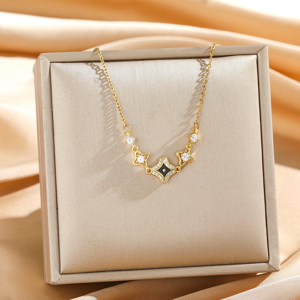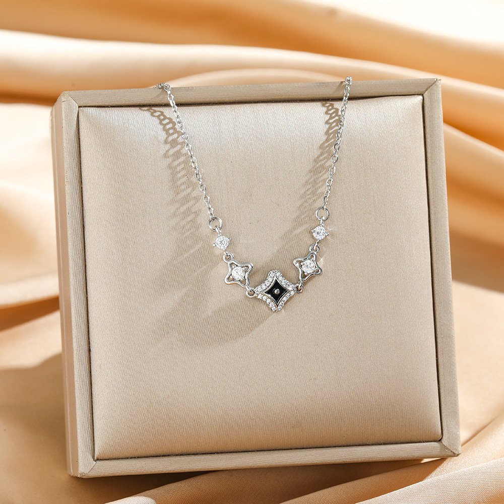 - The central black mother of pearl diamond star is the undeniable hero — a four-pointed geometric star shape inlaid with deep, lustrous black mother of pearl at its heart, surrounded by a dense pavé zircon border that makes the darkness at the center glow even more intensely by contrast