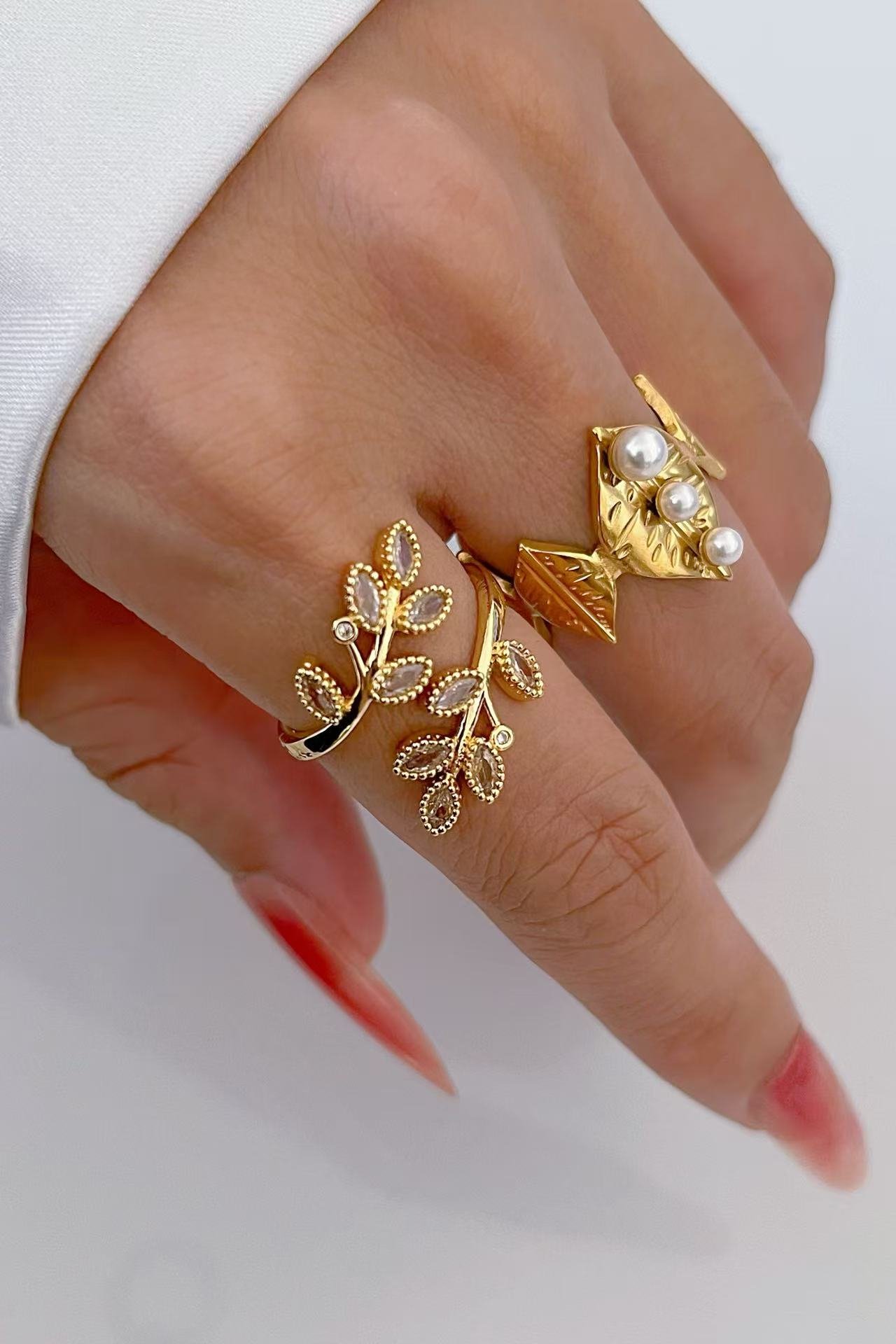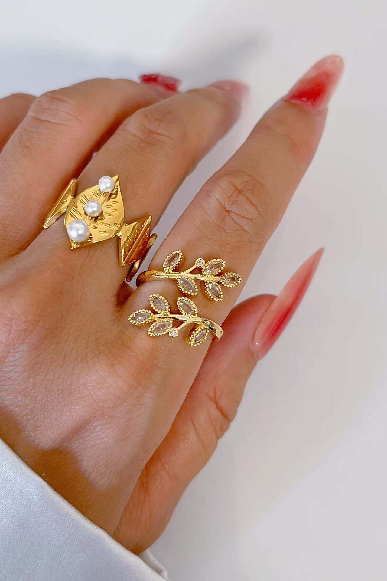 HEYBIJOU’s Verdant Whisper Zircon Leaf Wrap—18K gold titanium open ring with sparkling leaf inlays. Tarnish-free, water-wild elegance for fingers blooming in eternal spring!
