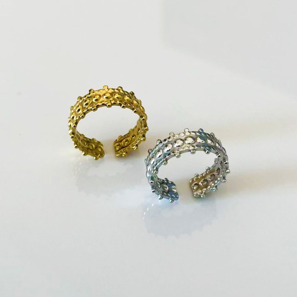 Vintage Palace Bubble Open Ring in 18k Gold/Silver. Wide statement band with textured bubbles. Tarnish-free titanium steel. Royal elegance!
