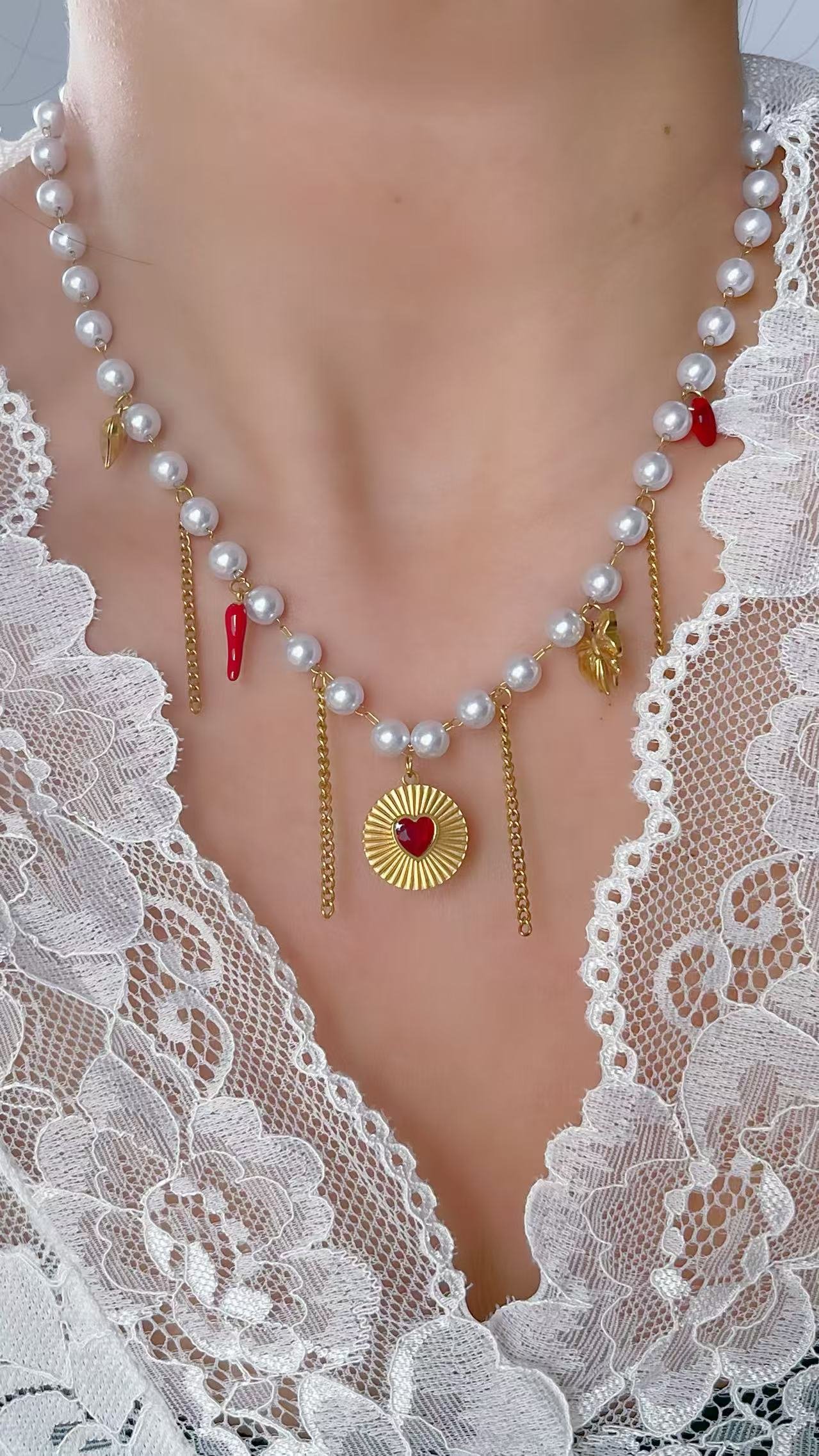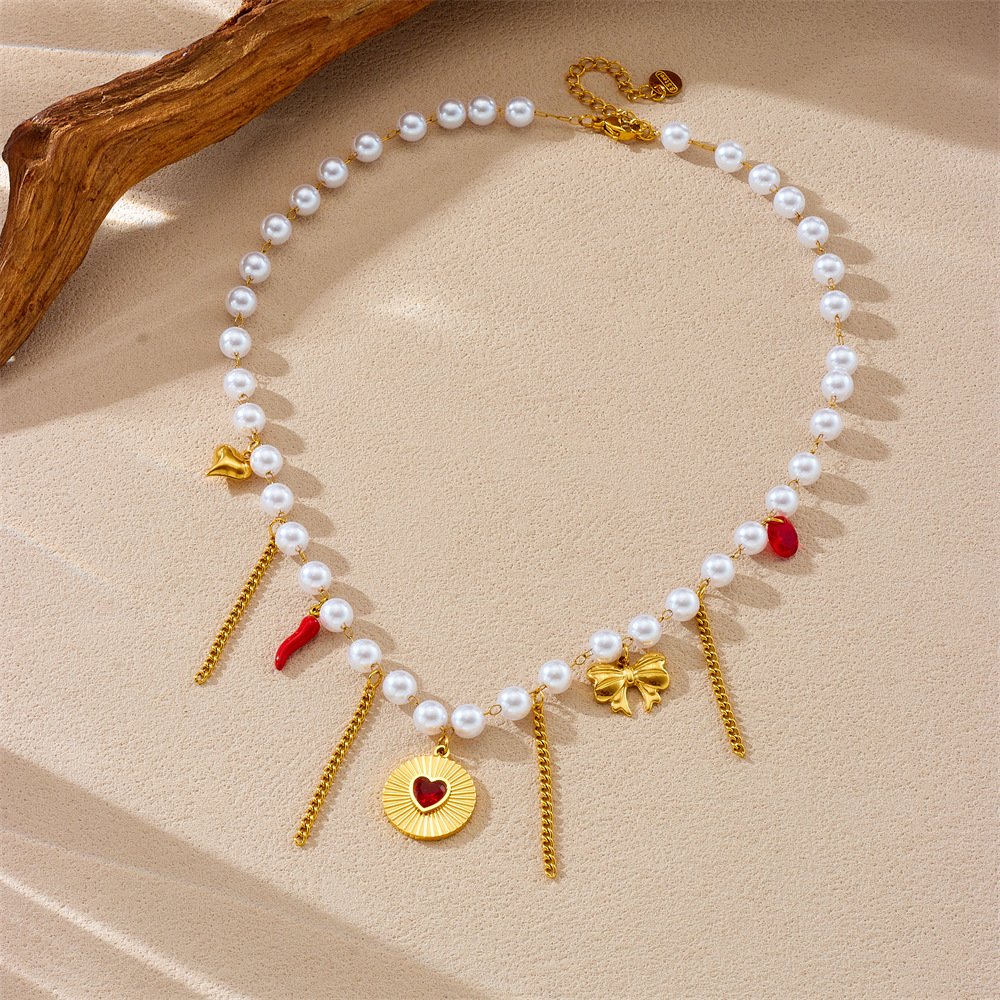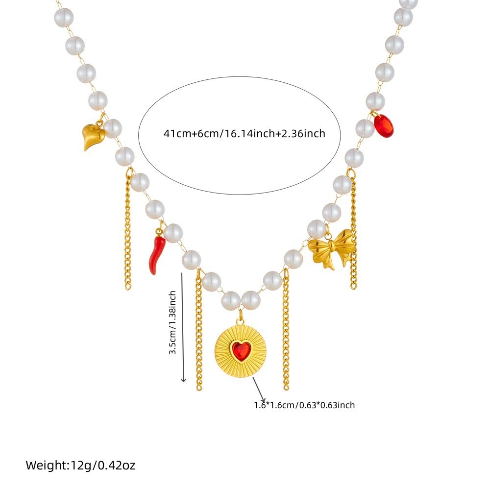 HEYBIJOU’s Whimsical Pearl Tassel Charm Necklace—18K gold multi-pendant strand with red heart sun & butterfly bows. Tarnish-free, waterproof romance for necks that narrate joy!