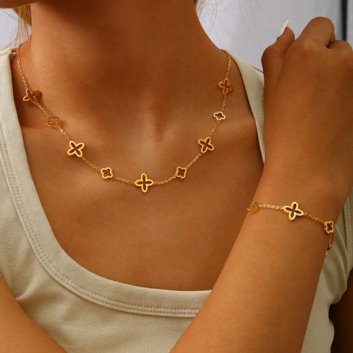 Elegant Hollow Clover Gold Necklace & Bracelet Set